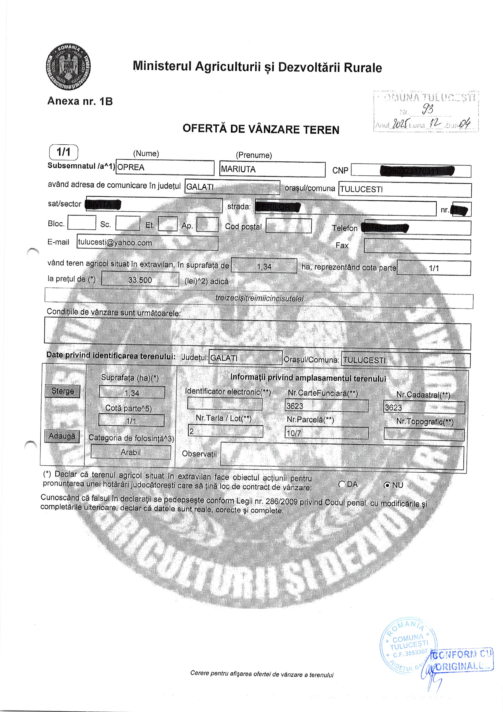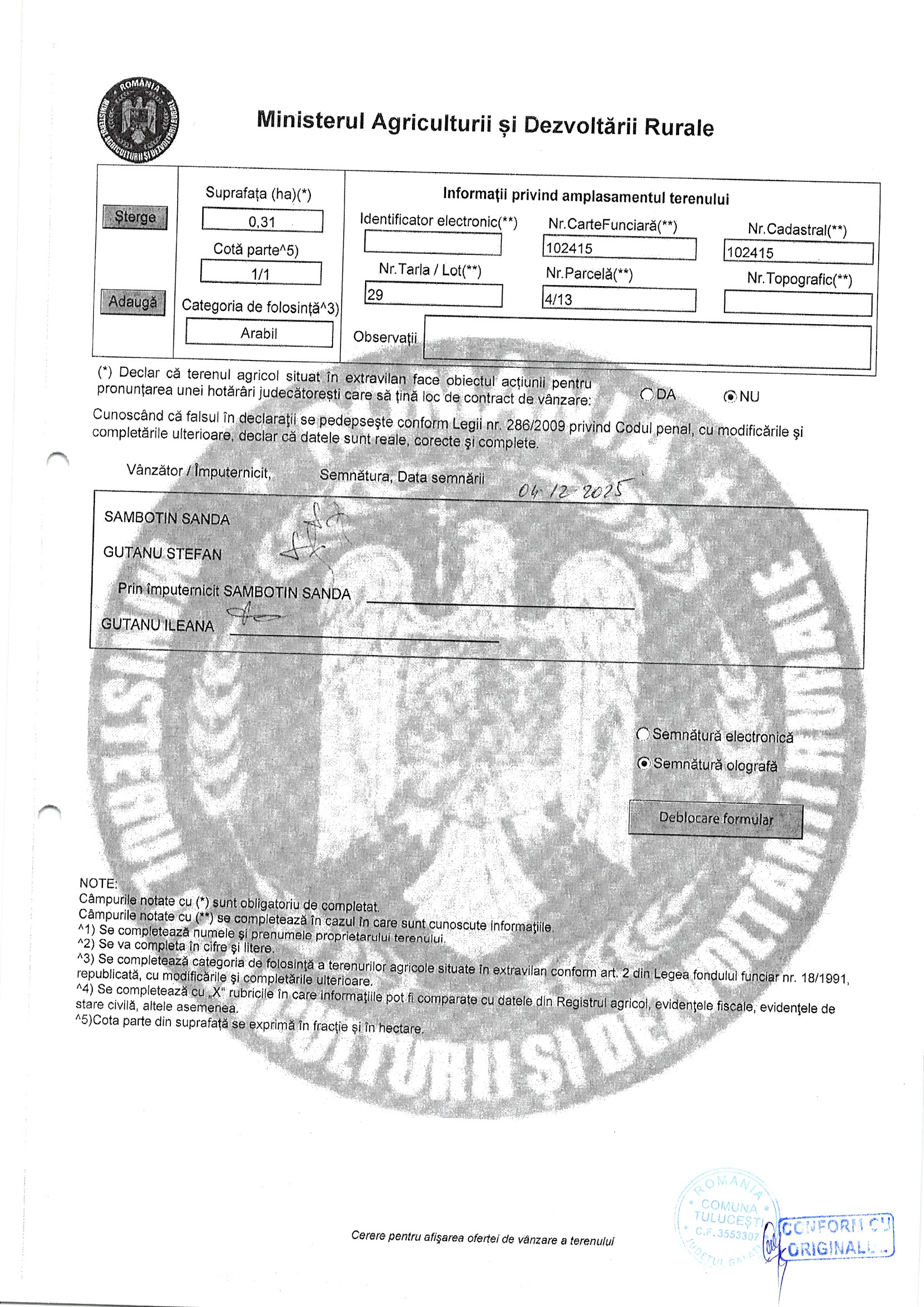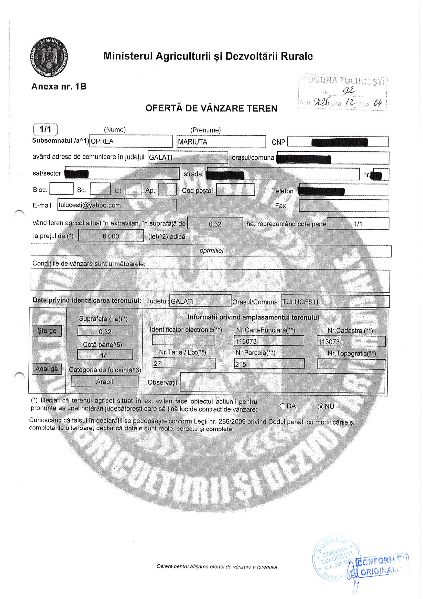 | 05.02.2026 | Oprea Mariuta | 123 | Tulucesti | 0.0762 HA | Dinu Florentina |