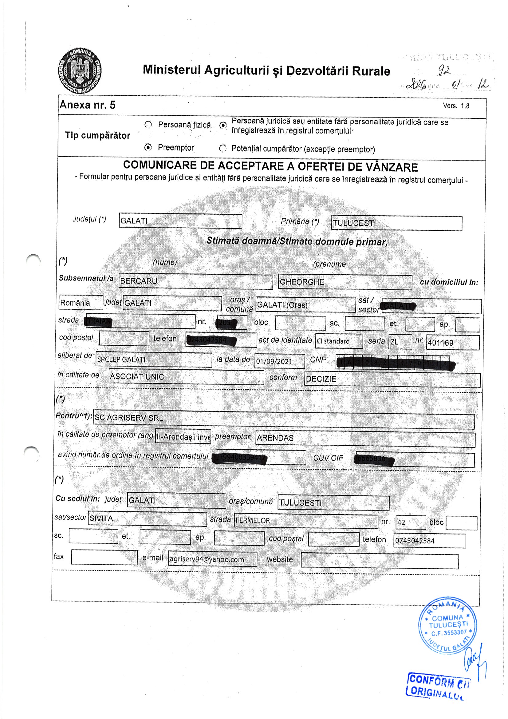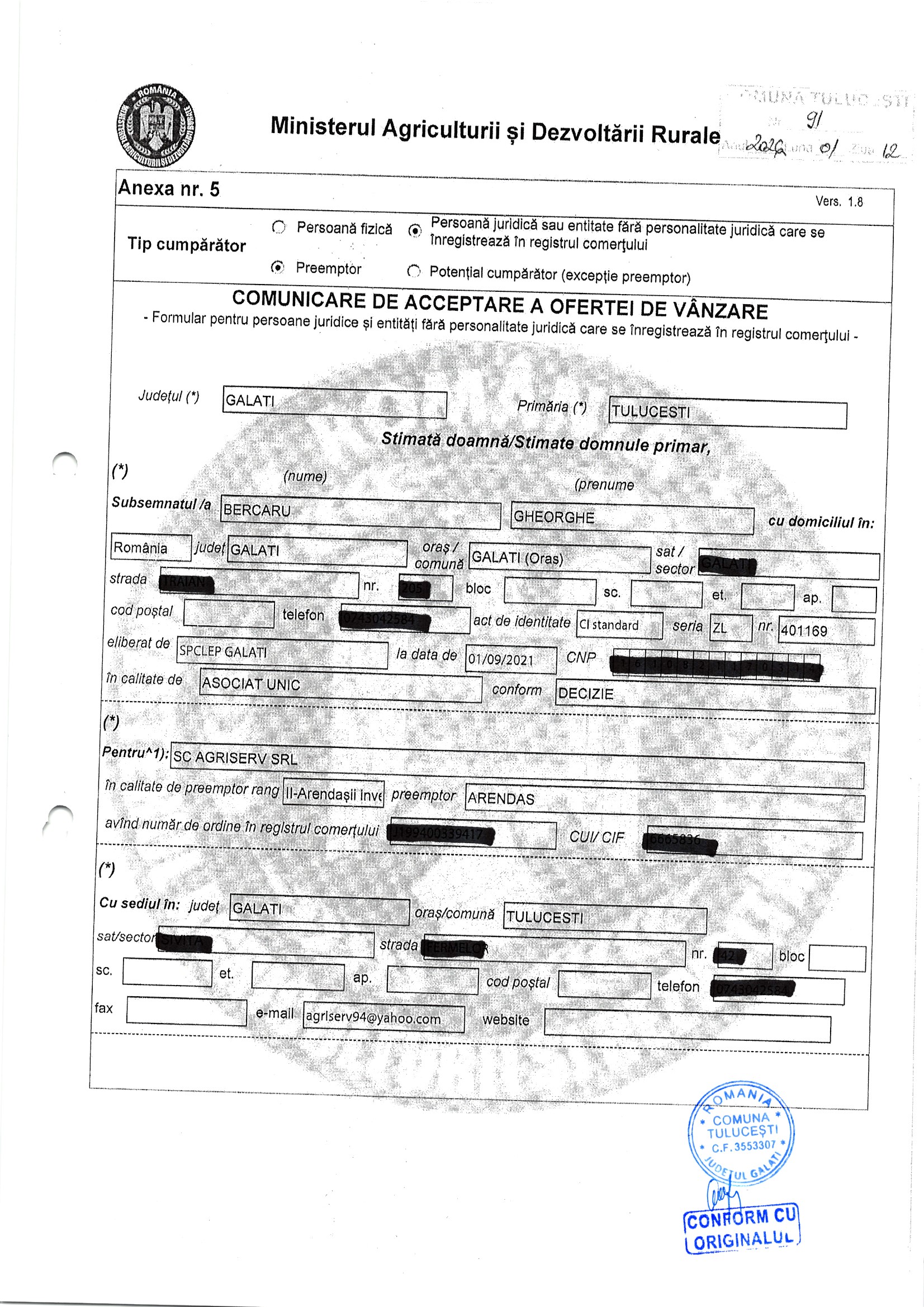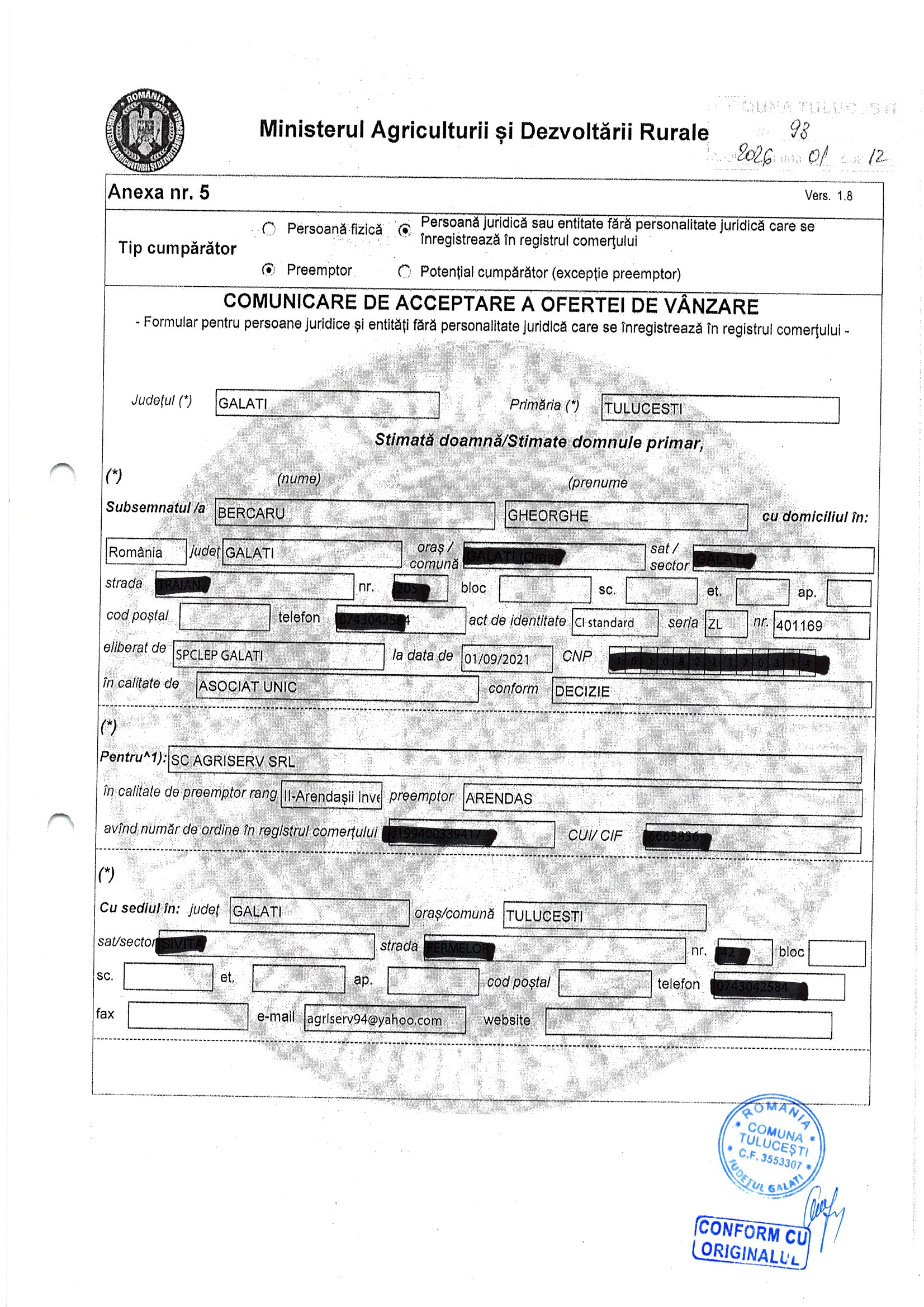 | 05.02.2026 | Oprea Mariuta | 123 | Tulucesti | 0.0762 HA | Dinu Florentina |