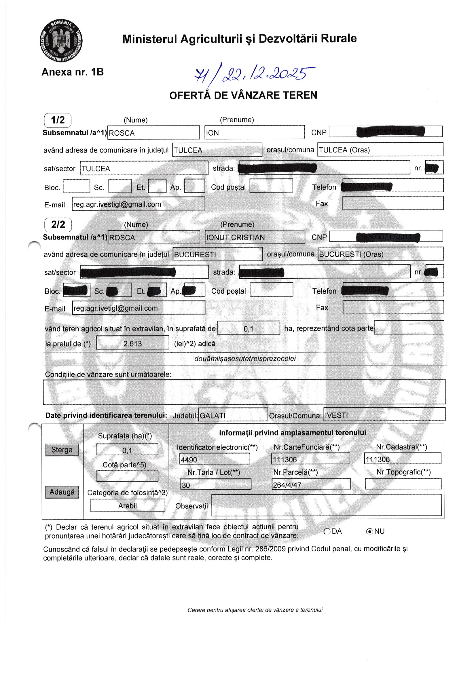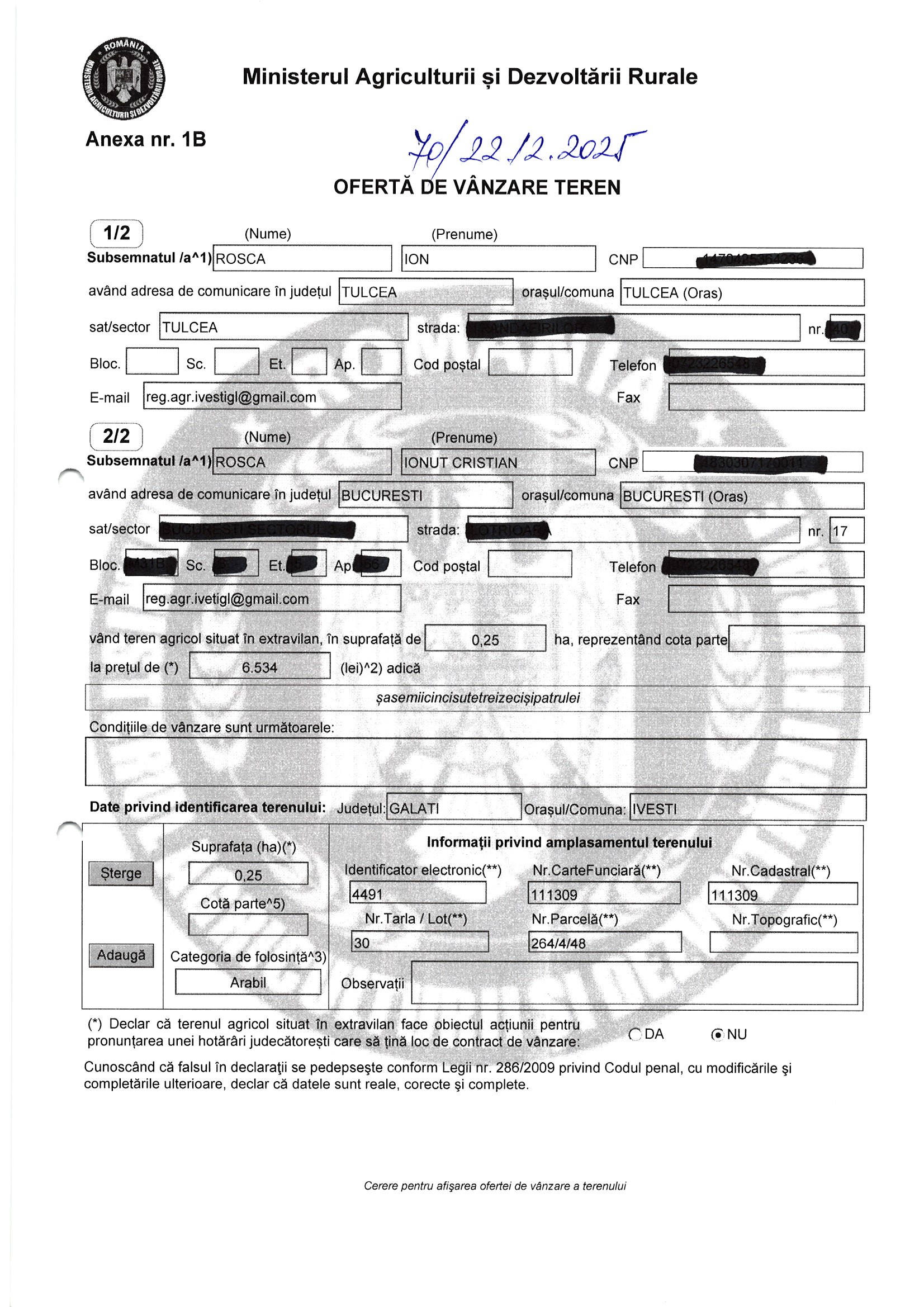 | 27.01.2026 | Rosca Ion | 123 | Ivesti | 0.25 HA | Dinu Florentina |