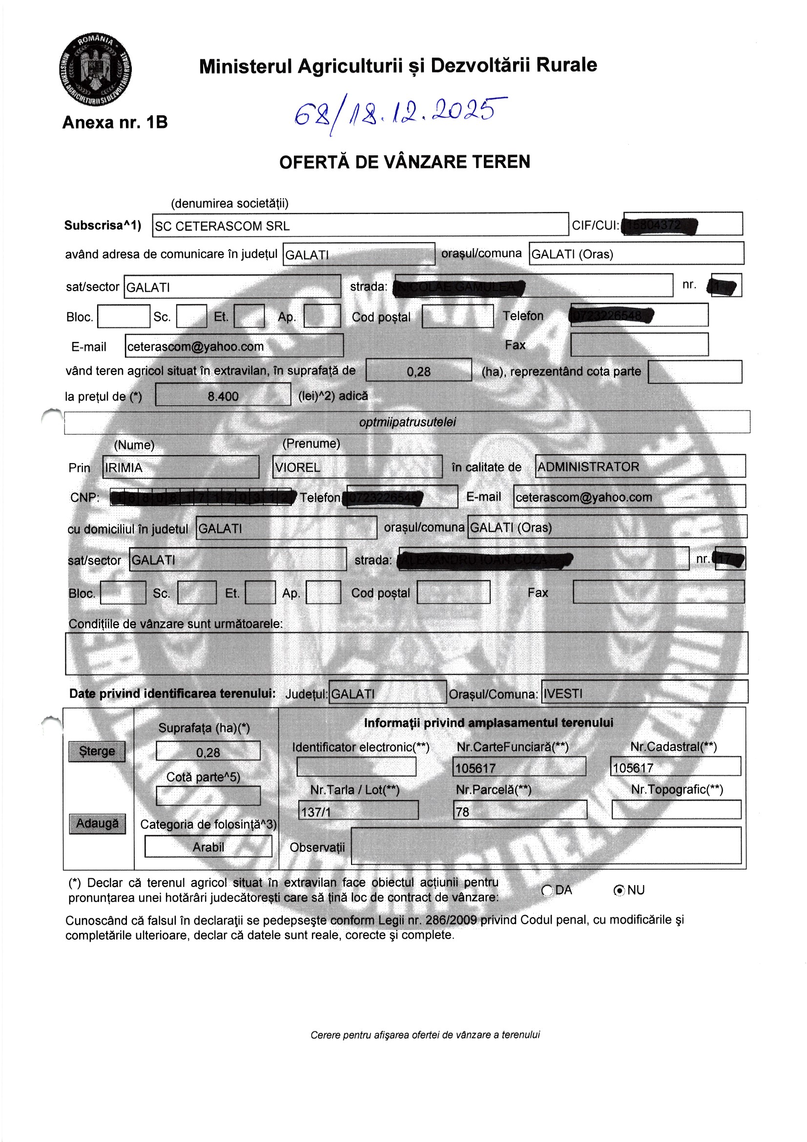 | 03.02.2026 | Ceterascom SRL | 123 | Ivesti | 0.37 HA | Dinu Florentina |
