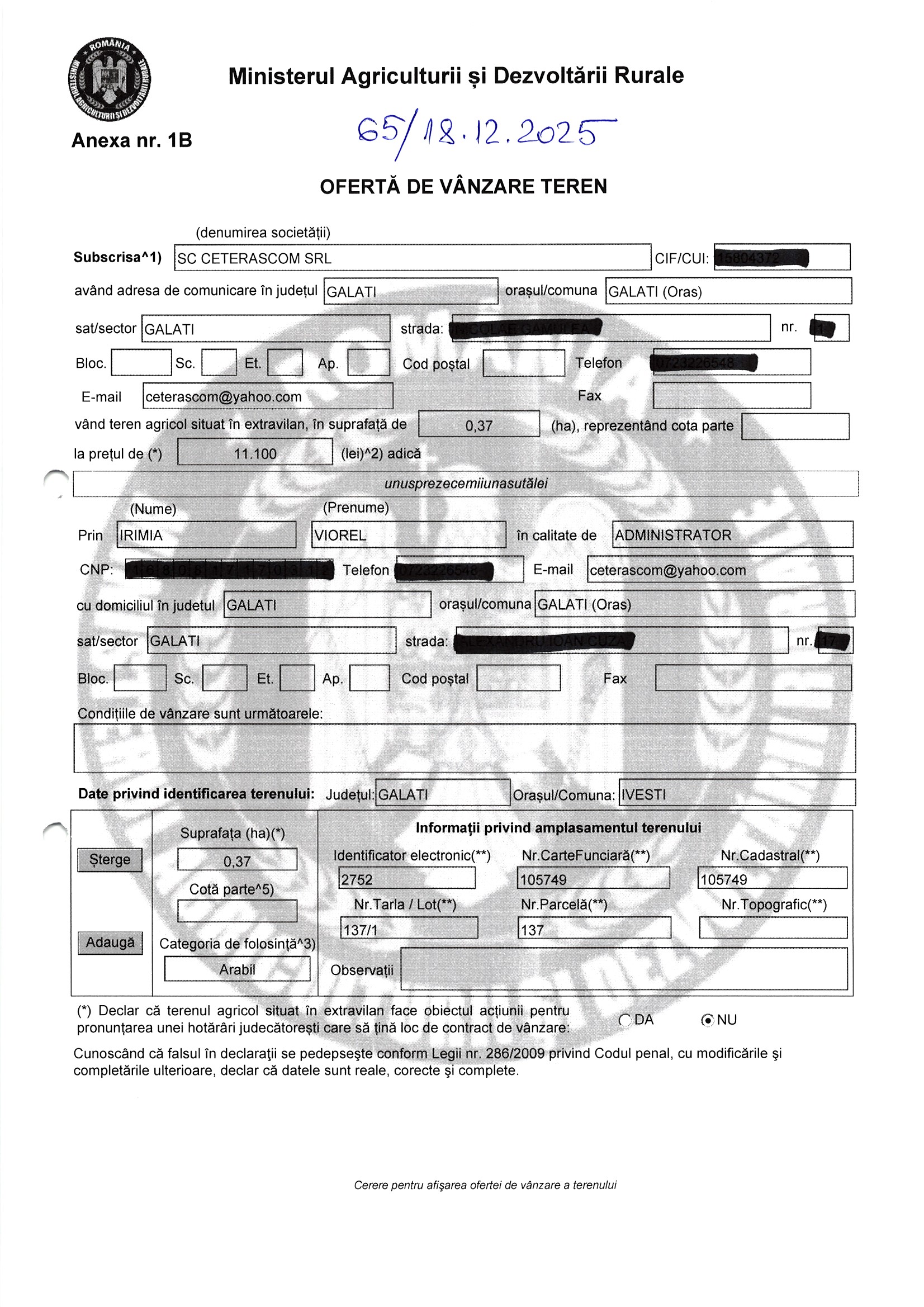 | 04.02.2026 | Ceterascom SRL | 123 | Ivesti | 0.22 HA | Dinu Florentina |