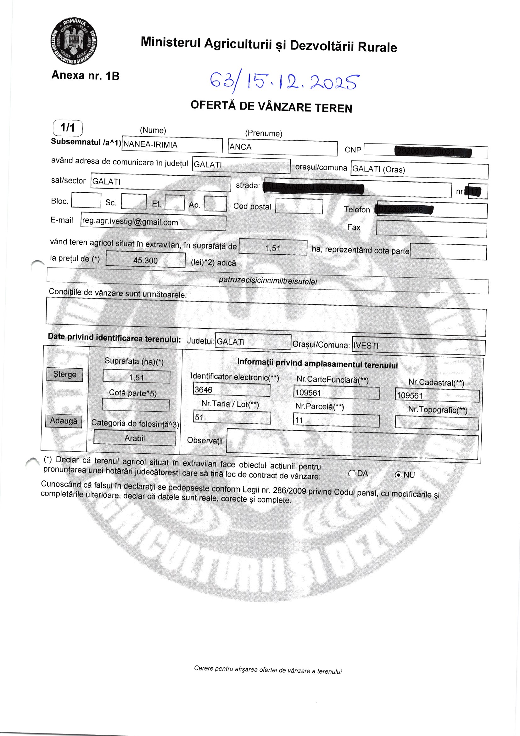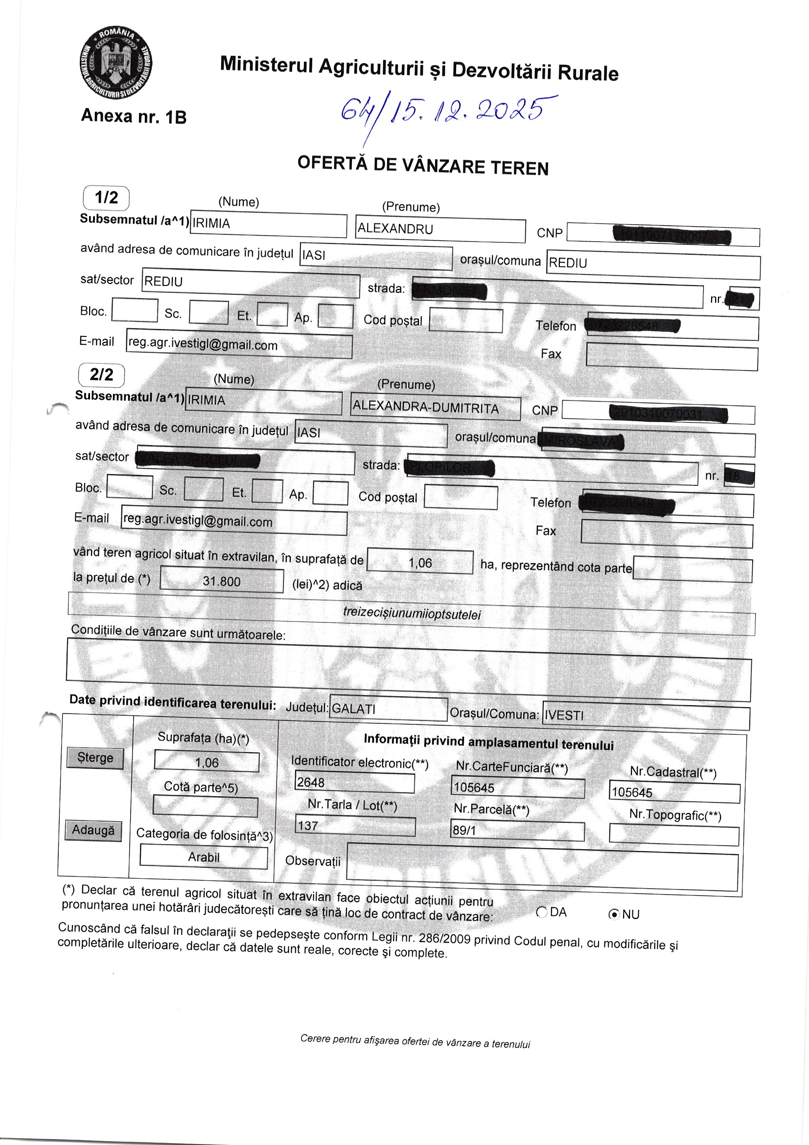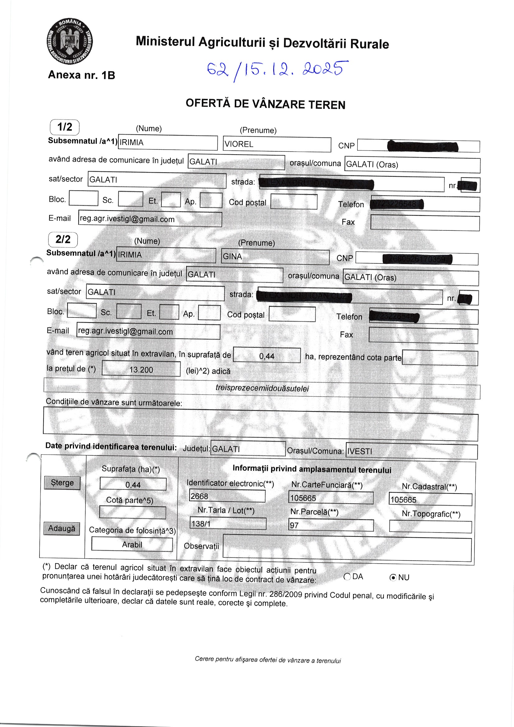 | 06.02.2026 | Irimia Viorel etc | 123 | Ivesti | 0.44 HA | Dinu Florentina |