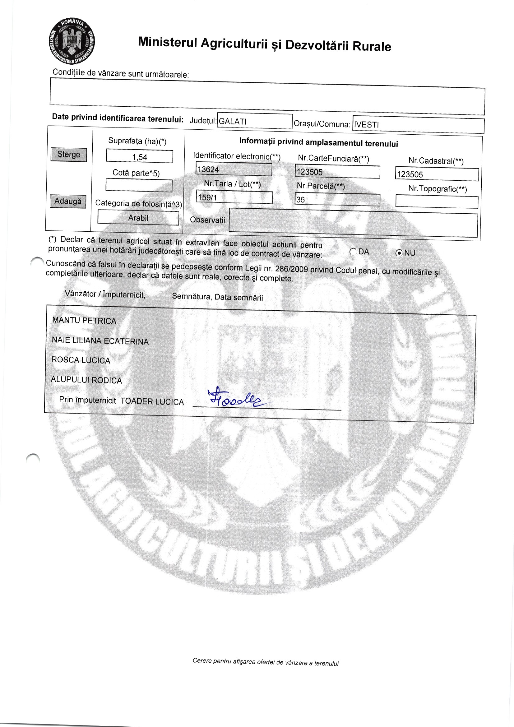 | 06.02.2026 | Mantu Petrica etc | 123 | Ivesti | 1.54 HA | Dinu Florentina |