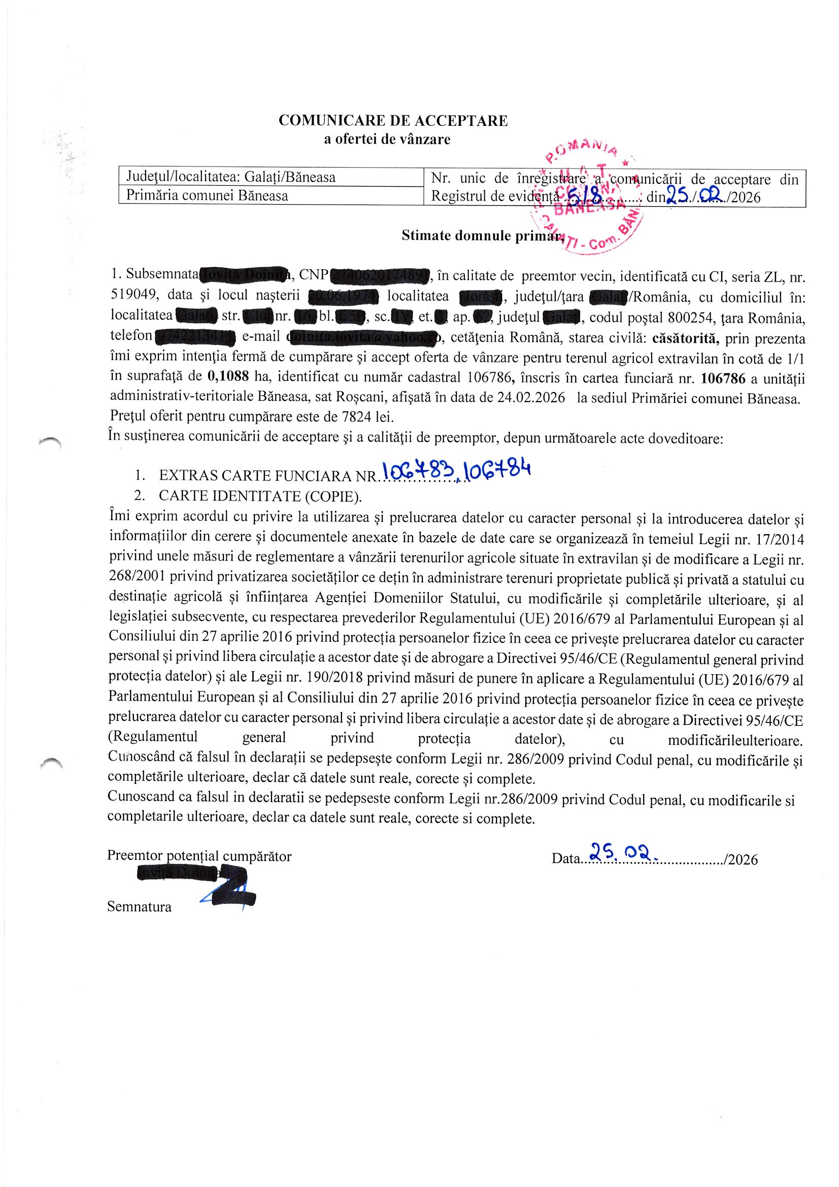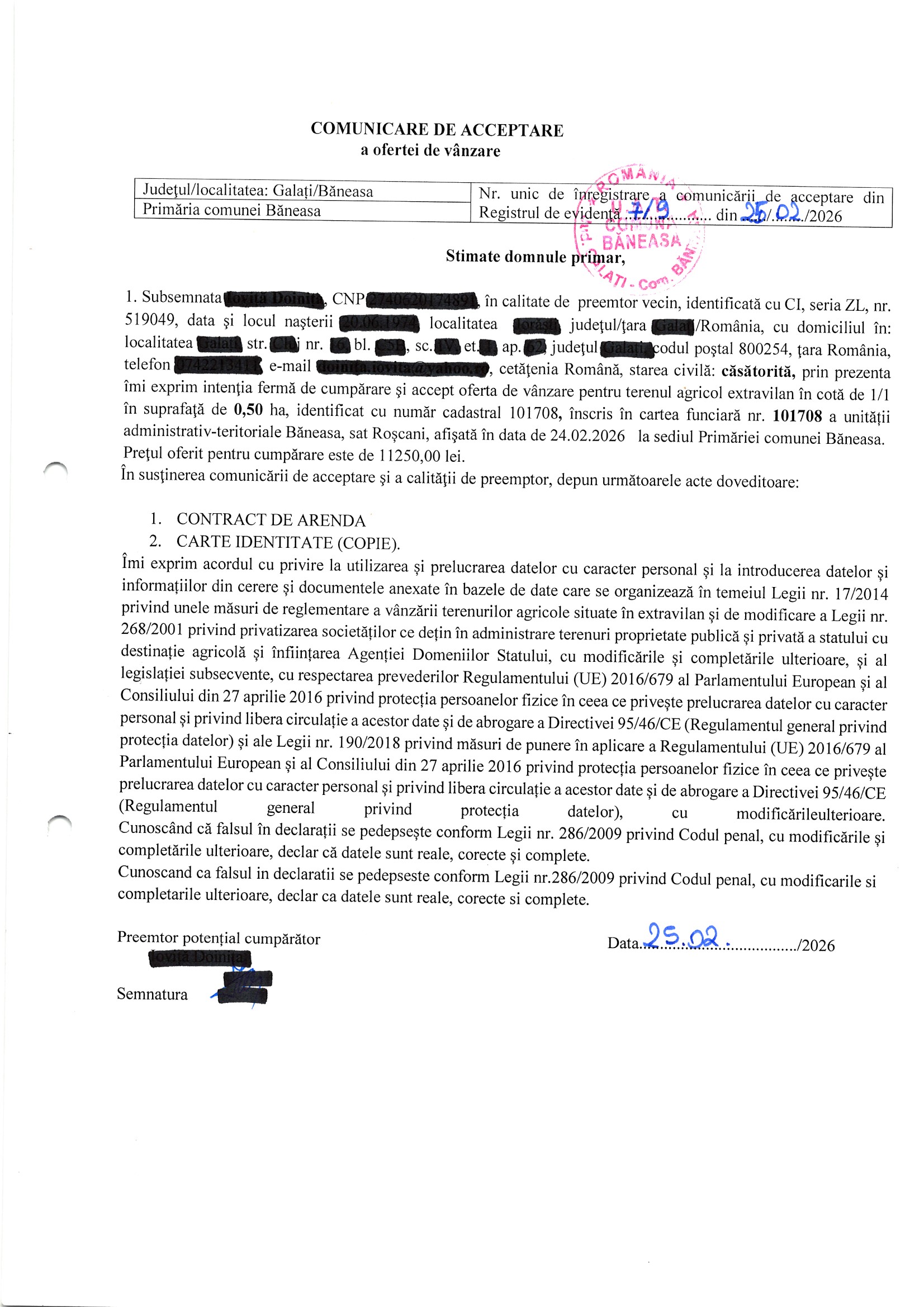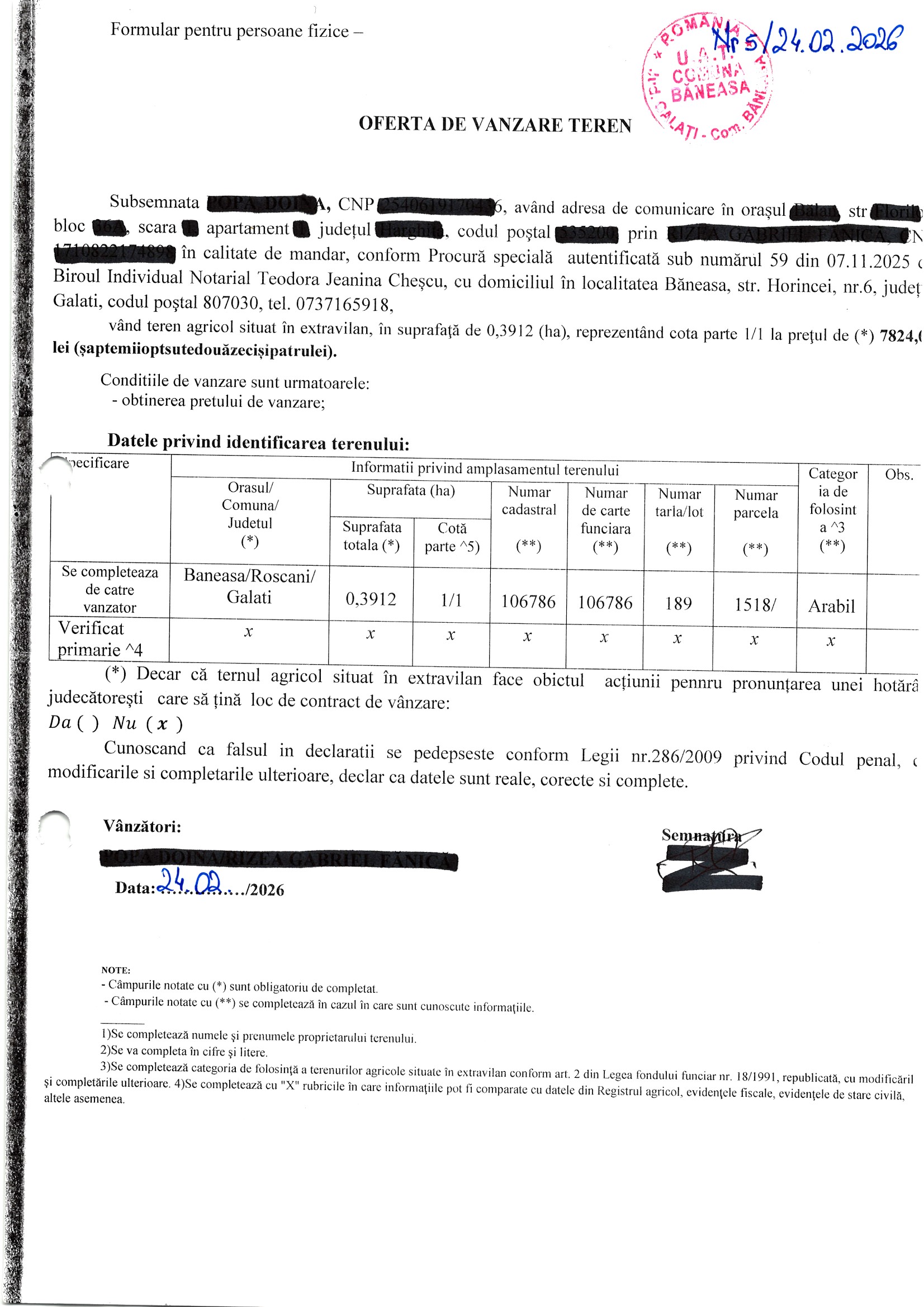| 13.03.2026 | PRISECARU CONSTANTIN | 123 | Nicoresti | 1,58 HA | TAMASLACARU LIDIA – ELENA |