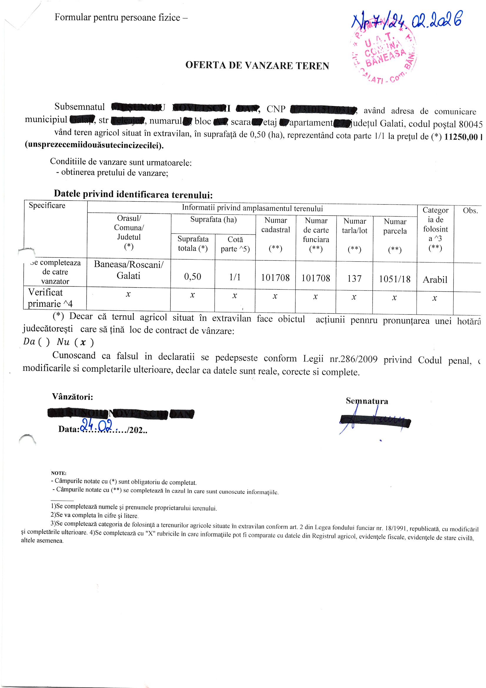 | 13.03.2026 | OCHIANU STEFAN sa | 123 | Beresti | 1,51 HA | TAMASLACARU LIDIA – ELENA |