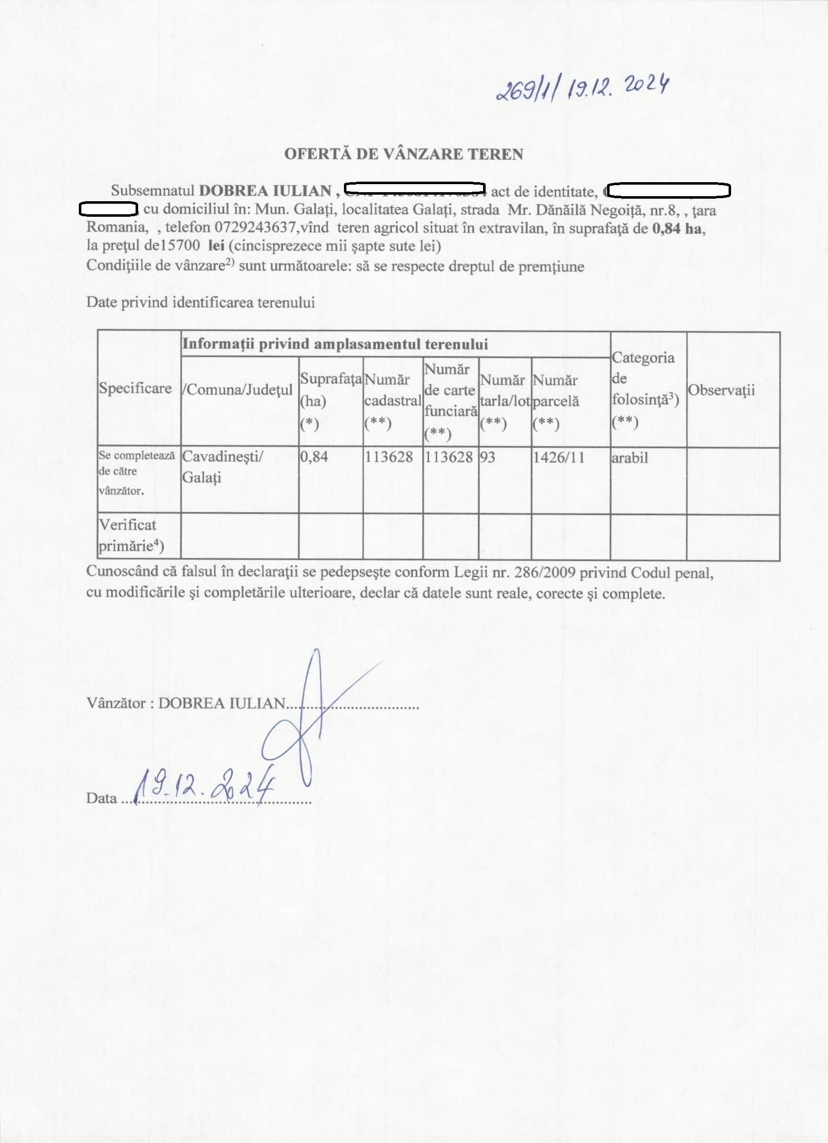 | 18.09.2025 | DOMNITANU NICU | 123 | Branistea | 1,0802 HA | Mocanu Monica Elena |