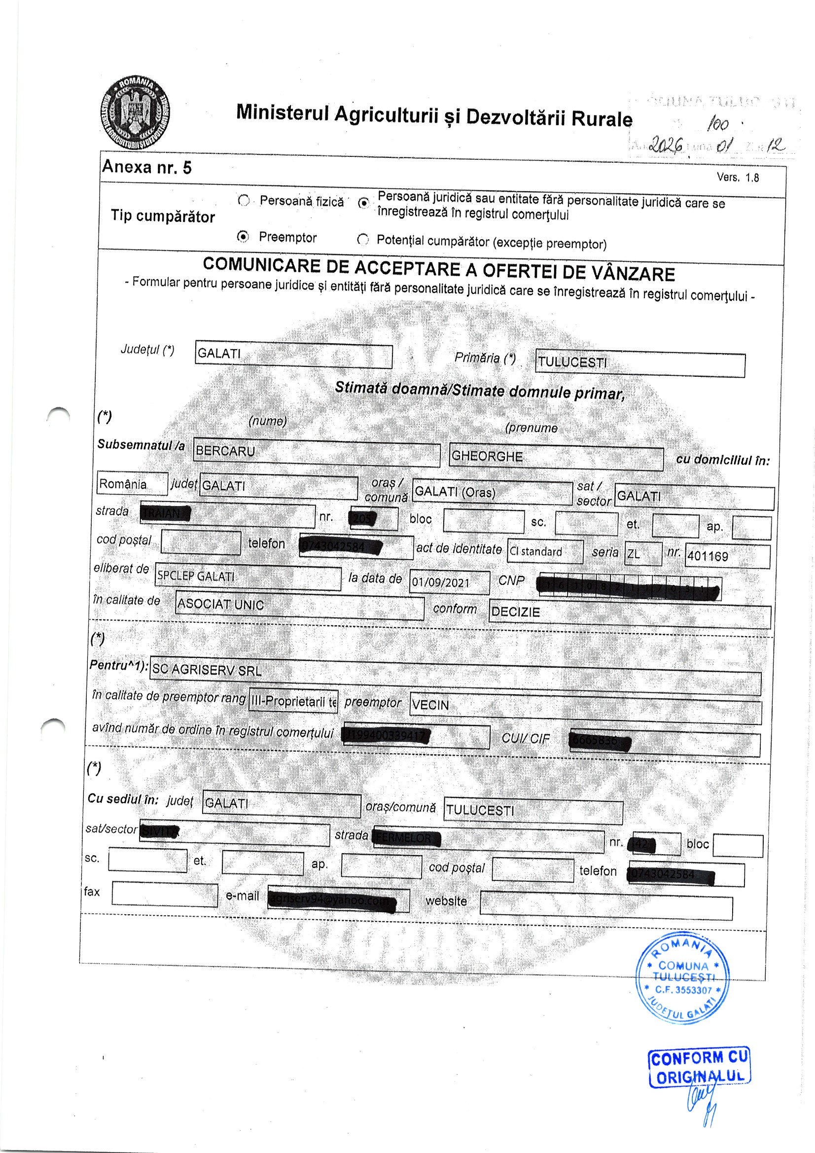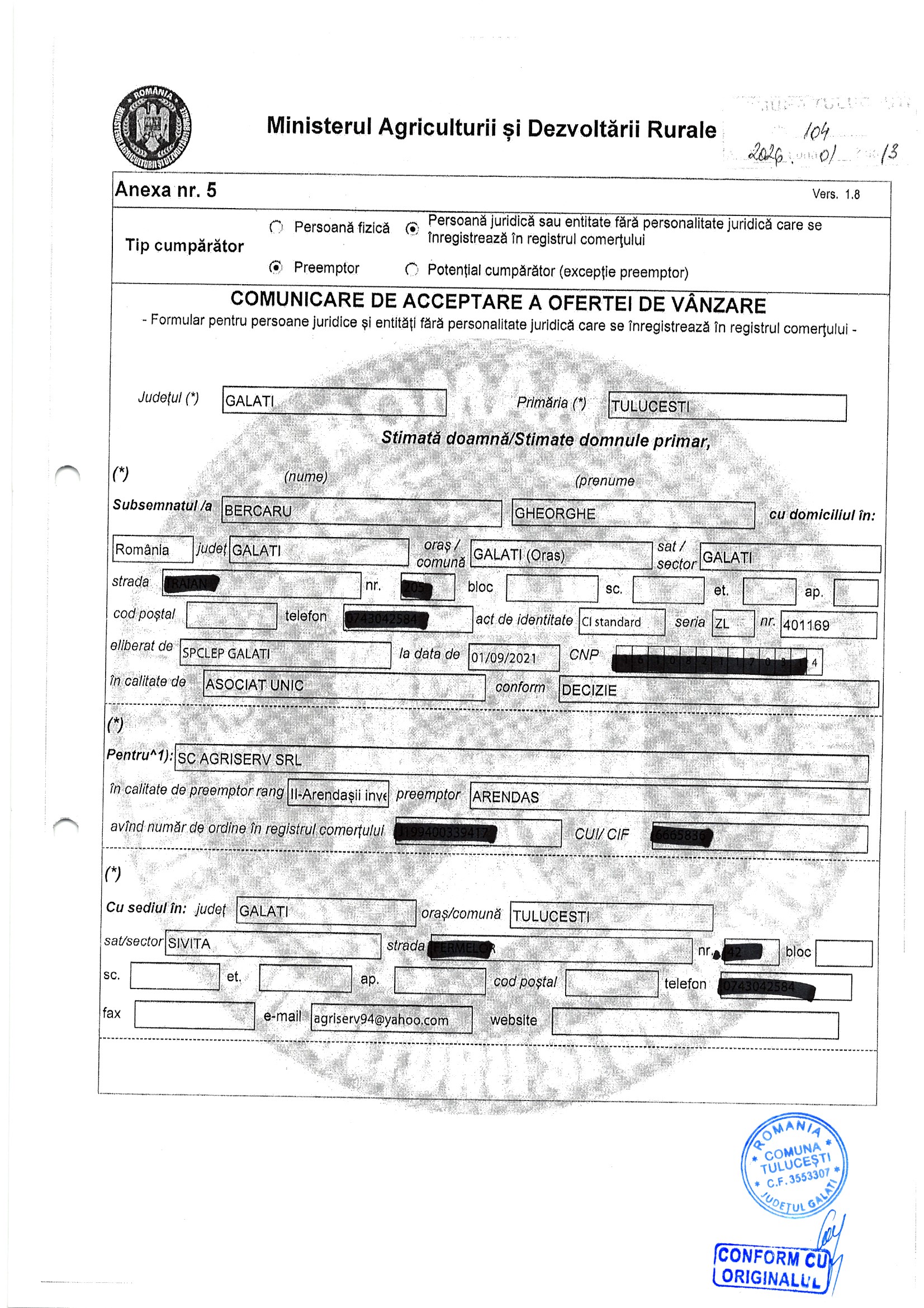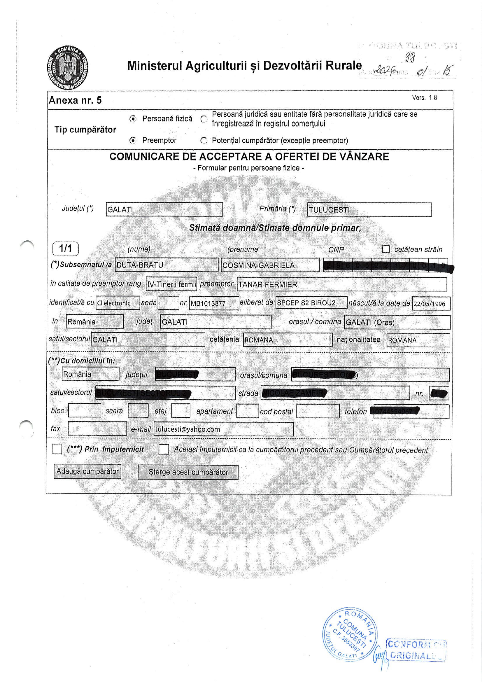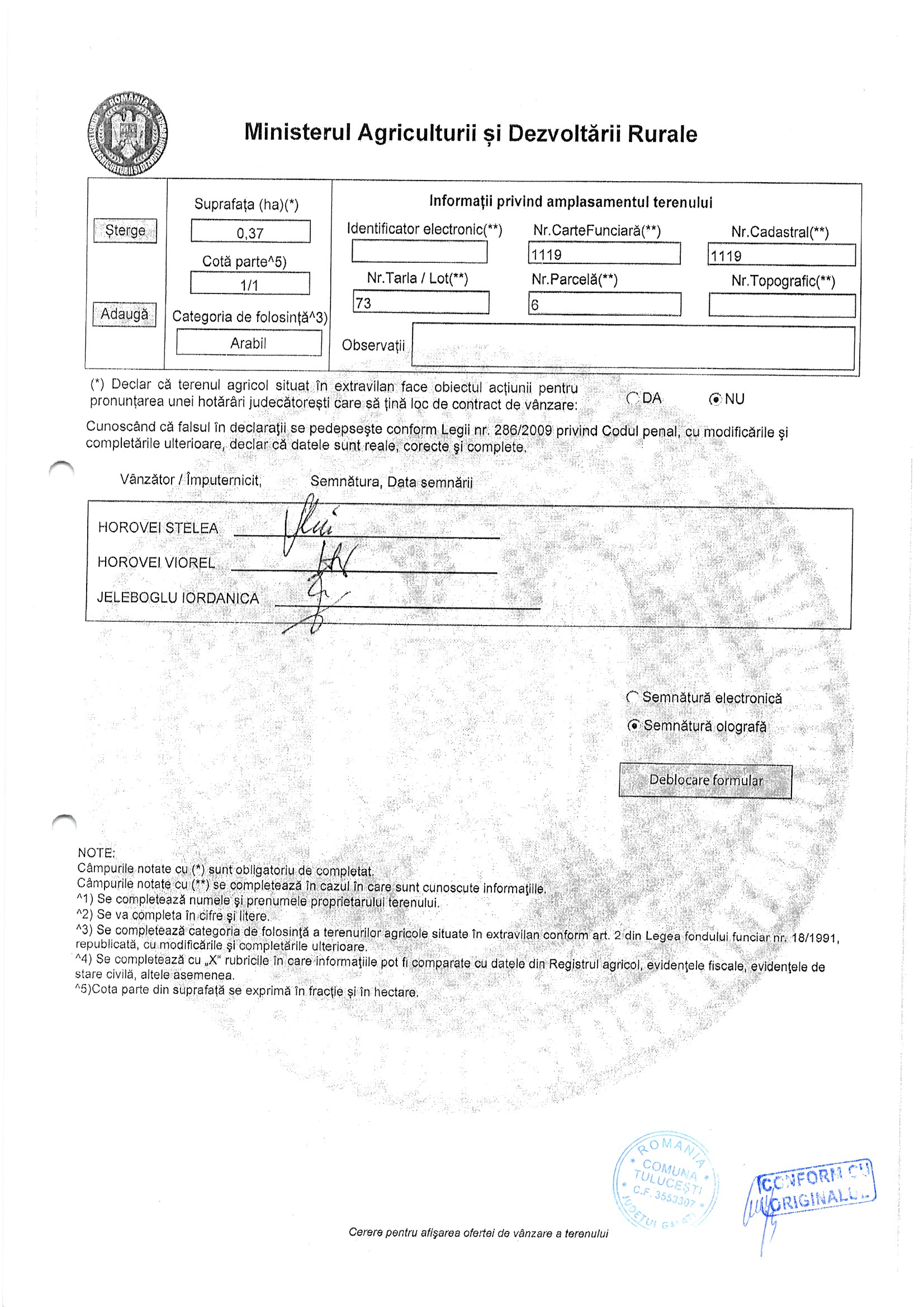 | 06.02.2026 | Sima Ionut | 123 | Tulucesti | 1.05 HA | Dinu Florentina |