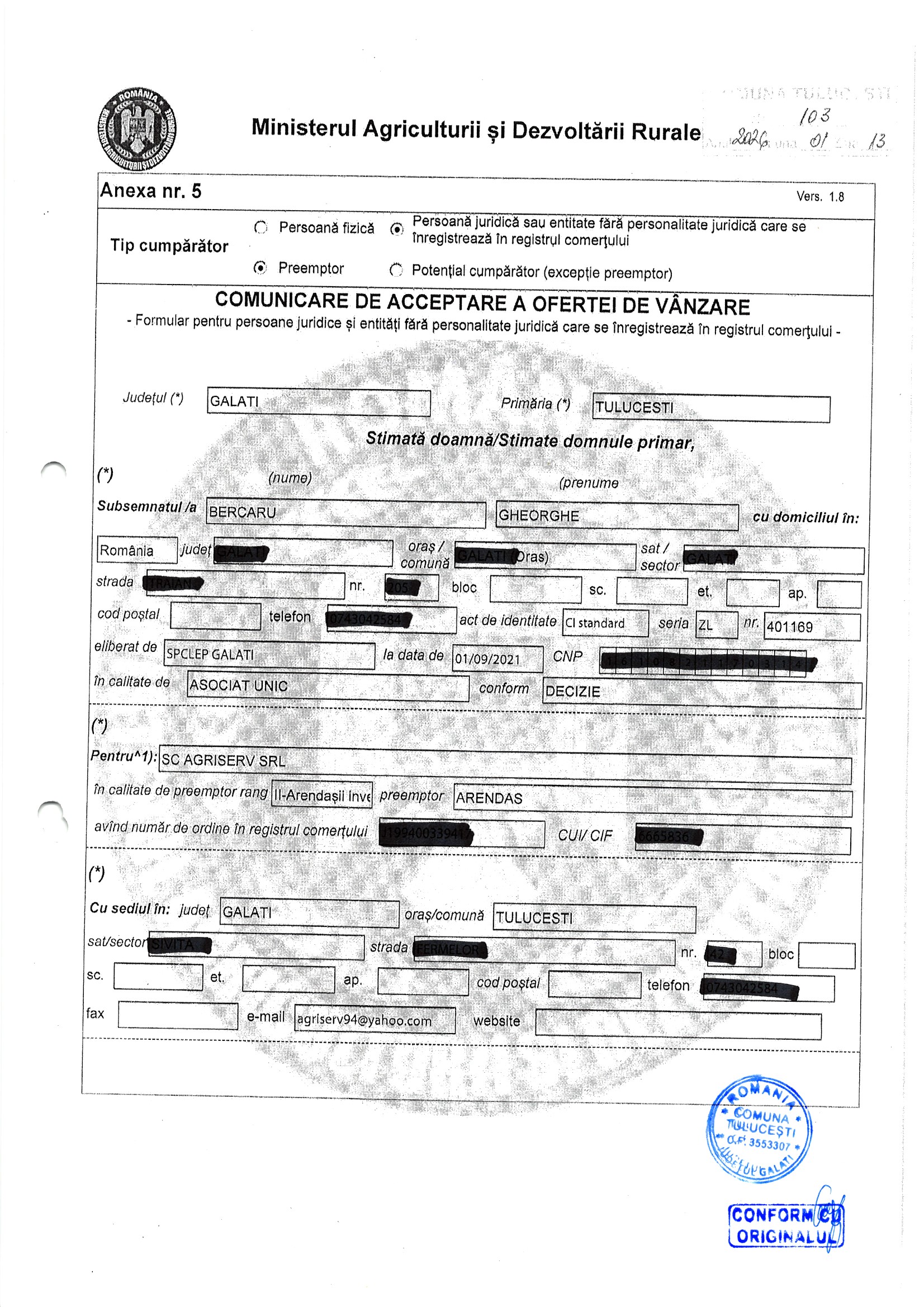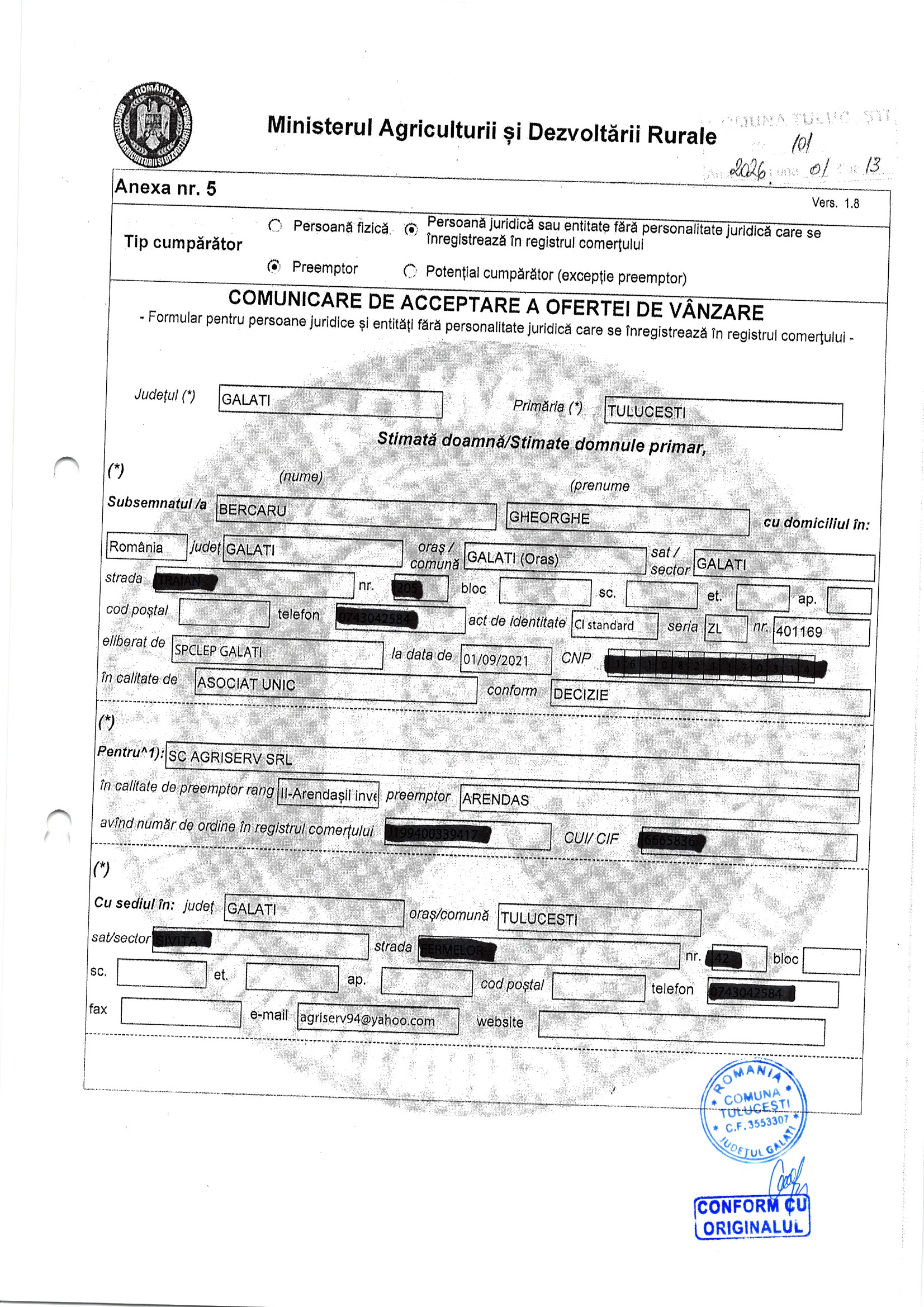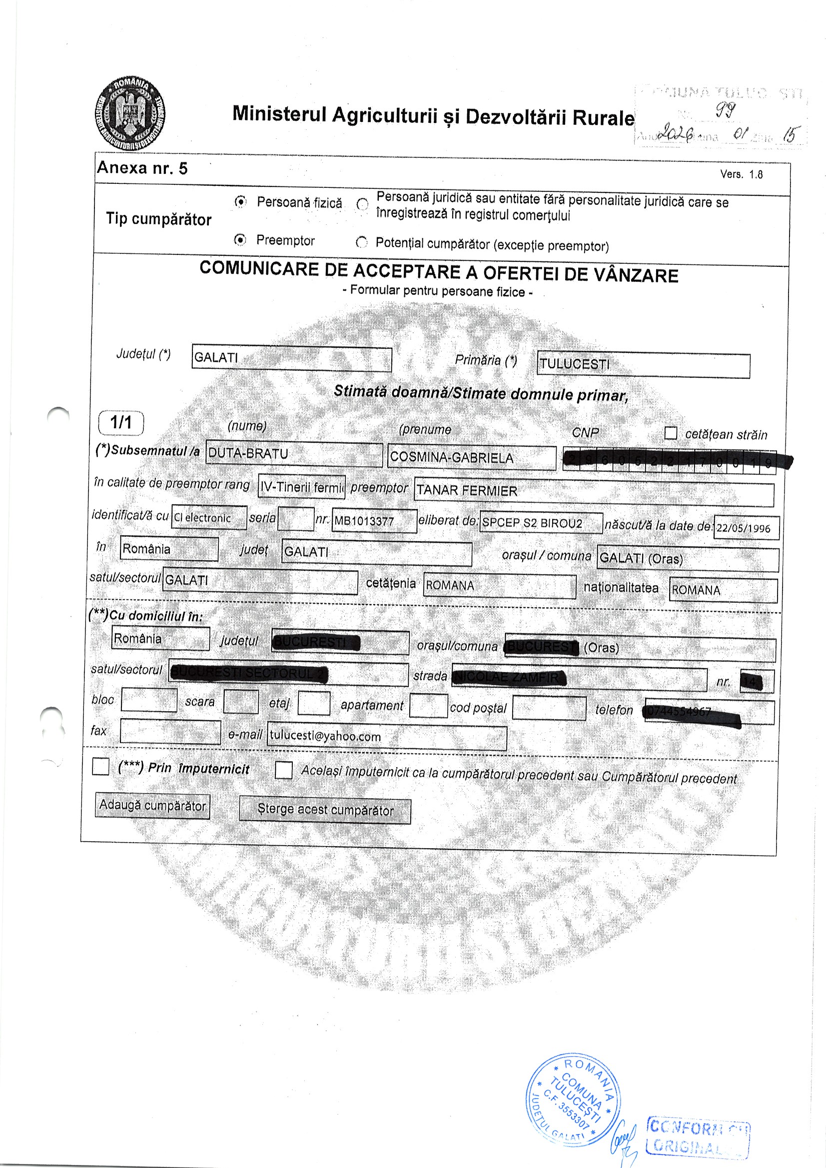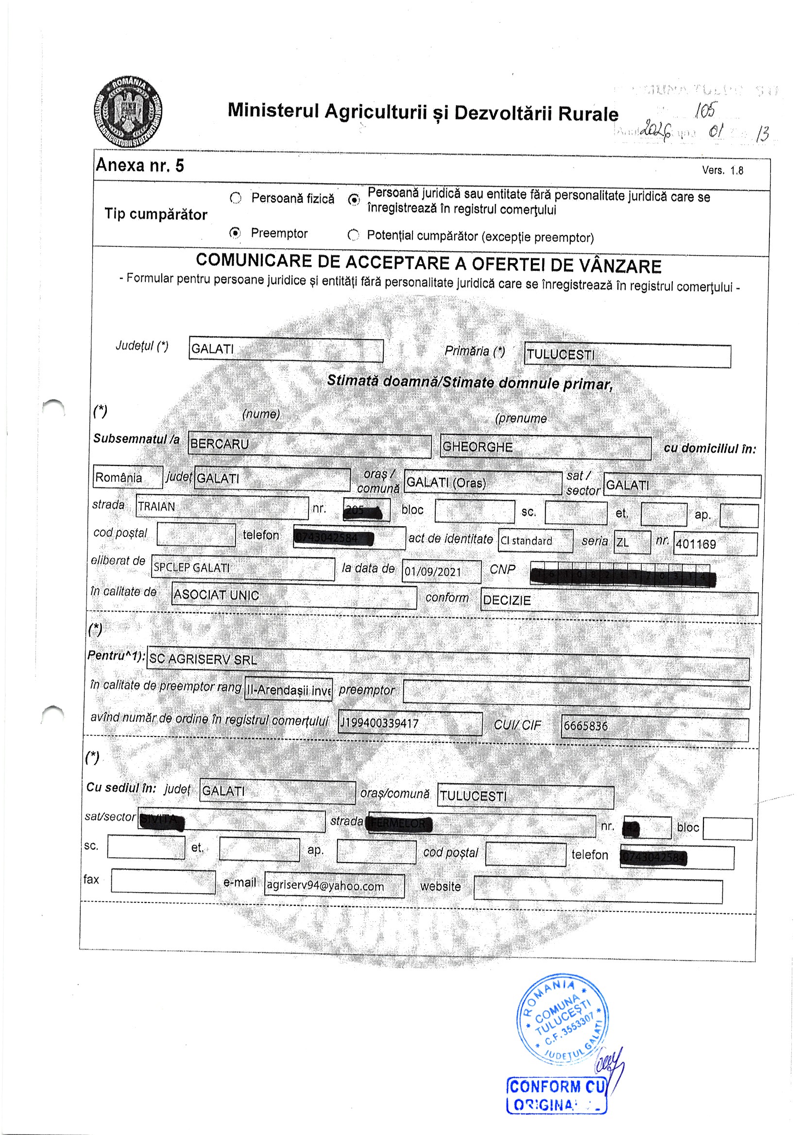 | 06.02.2026 | Sima Ionut | 123 | Tulucesti | 1.05 HA | Dinu Florentina |