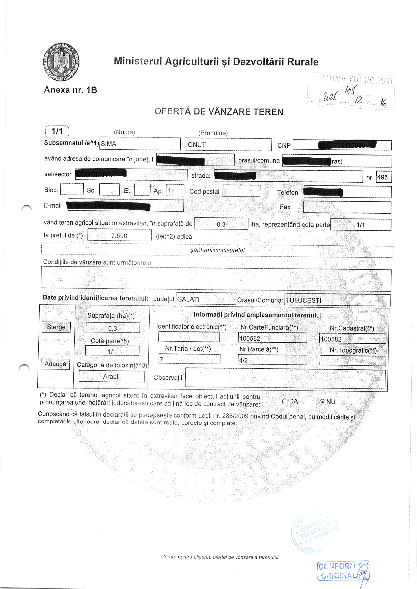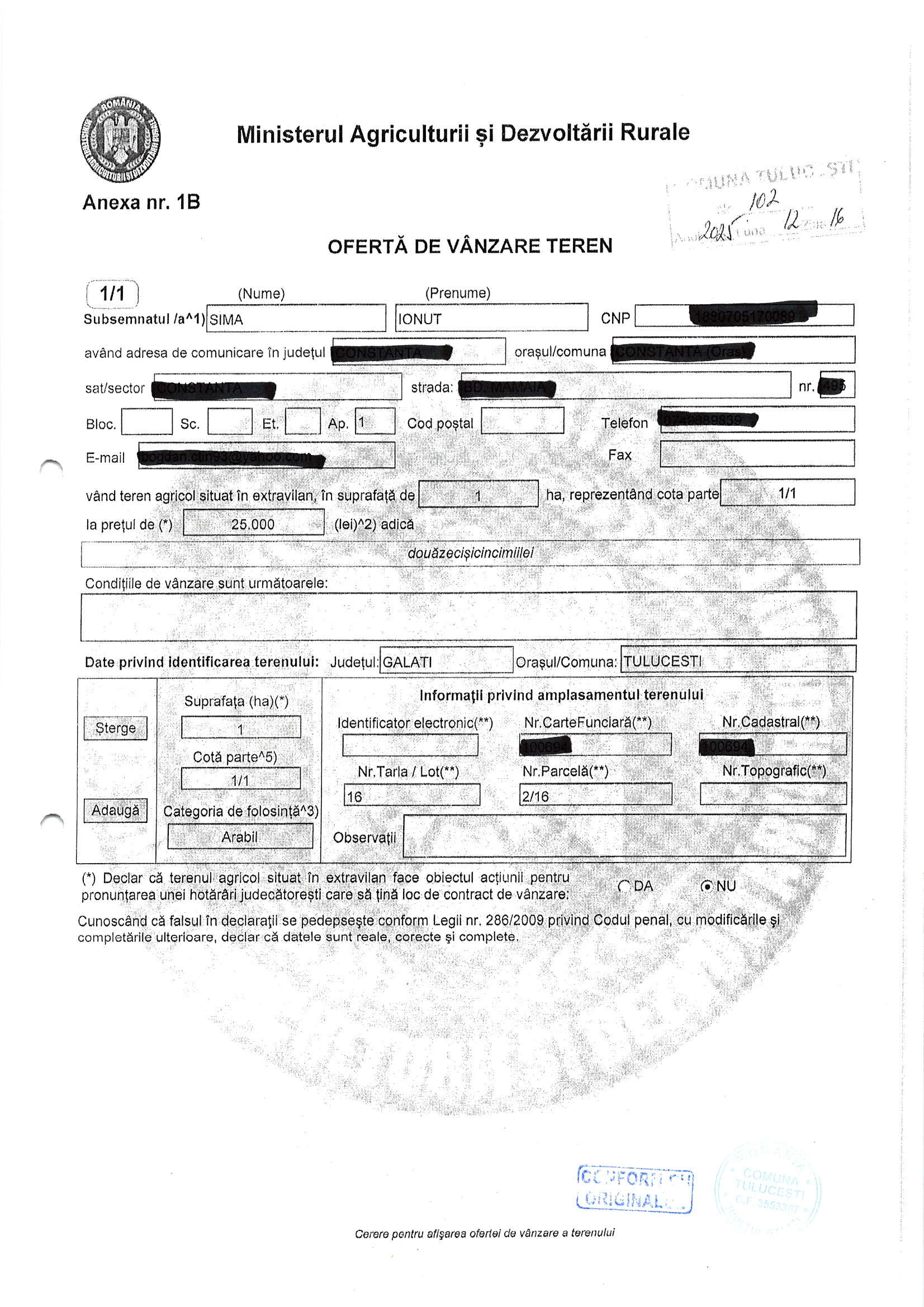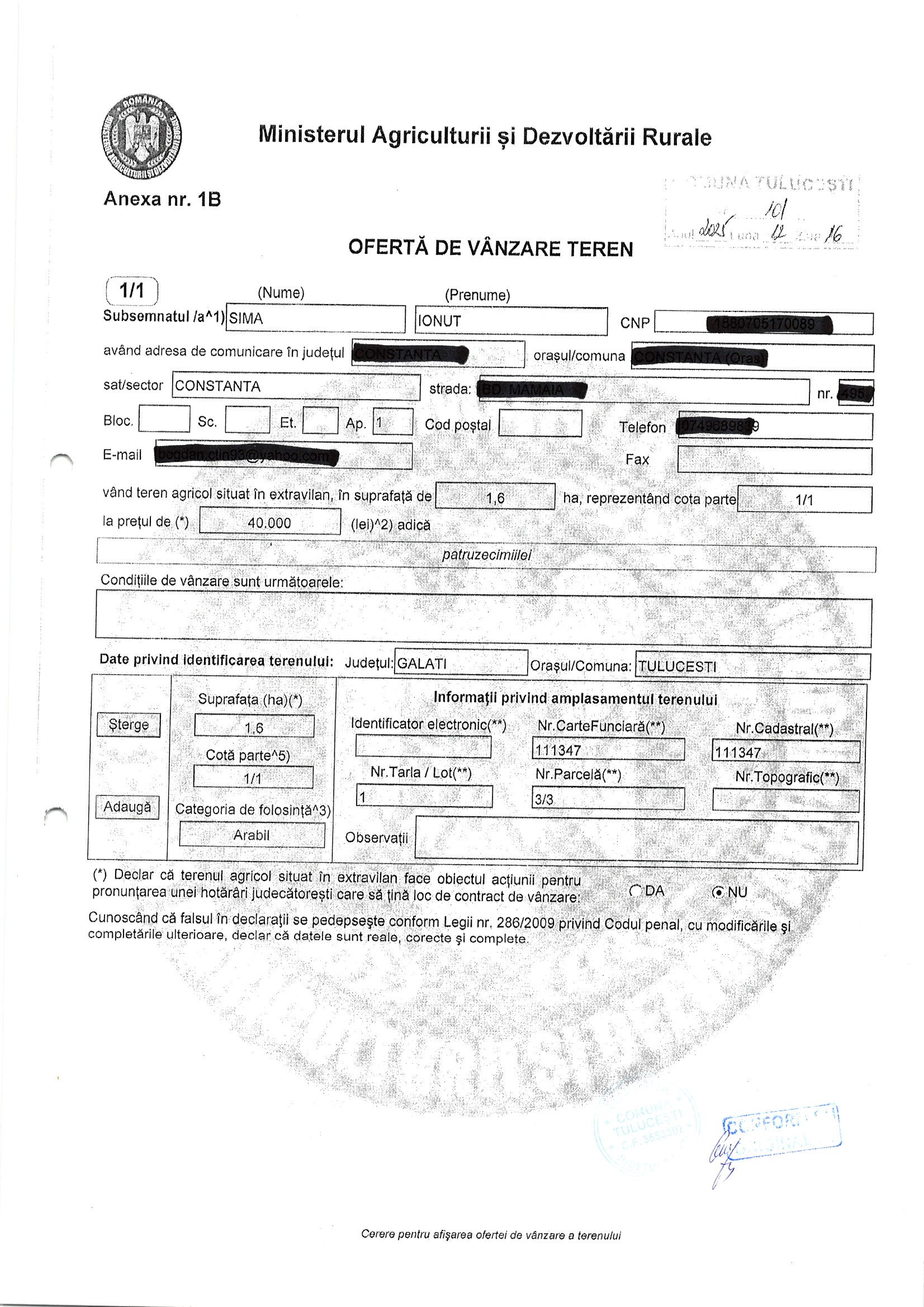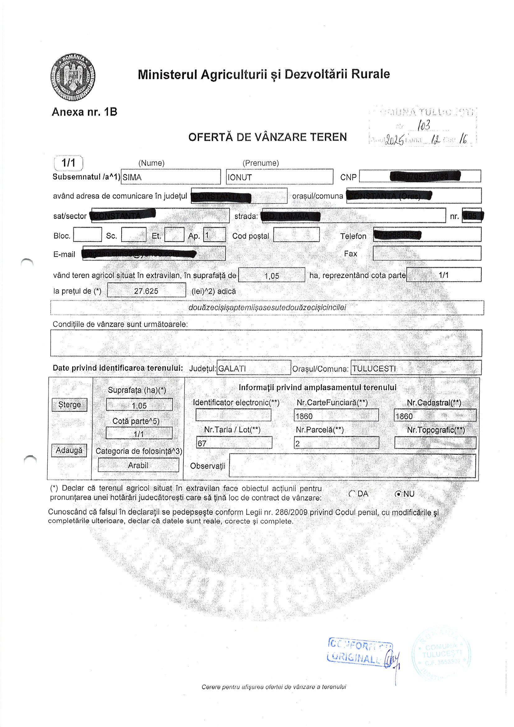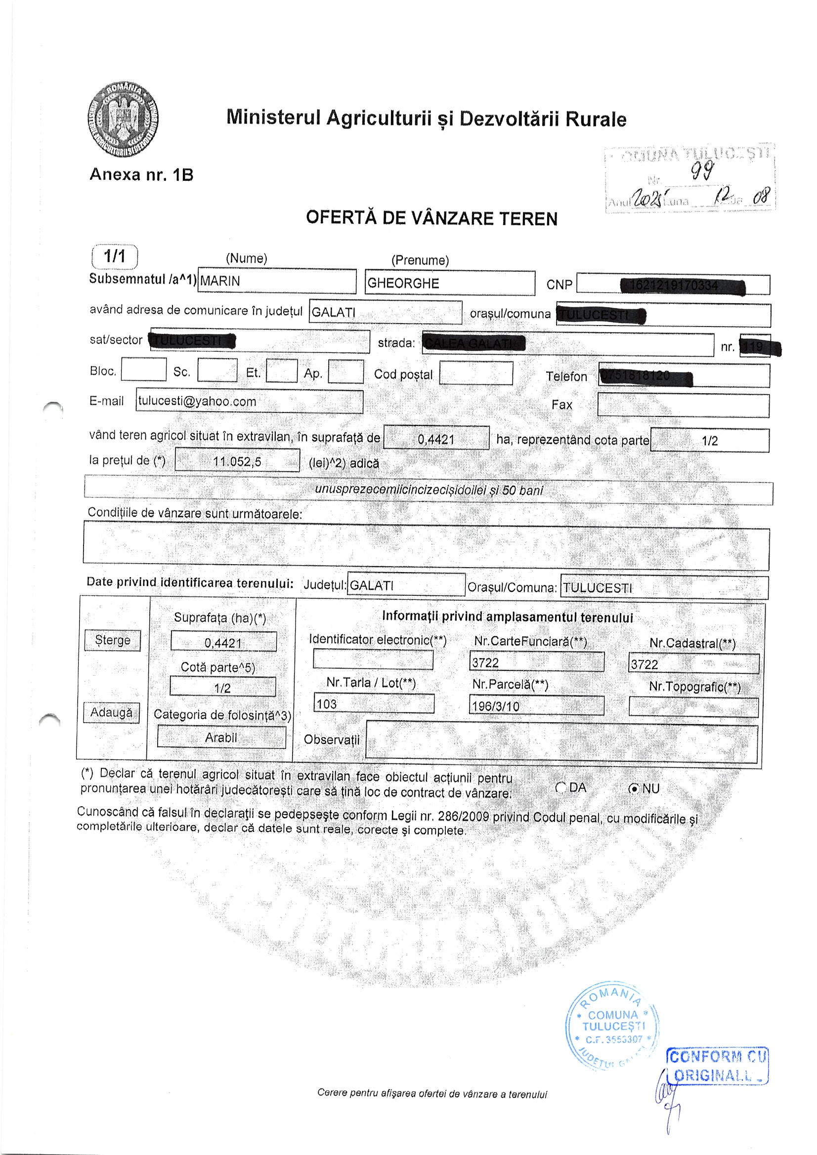 | 06.02.2026 | Marin Gheorghe | 123 | Tulucesti | 0.4421 HA | Dinu Florentina |