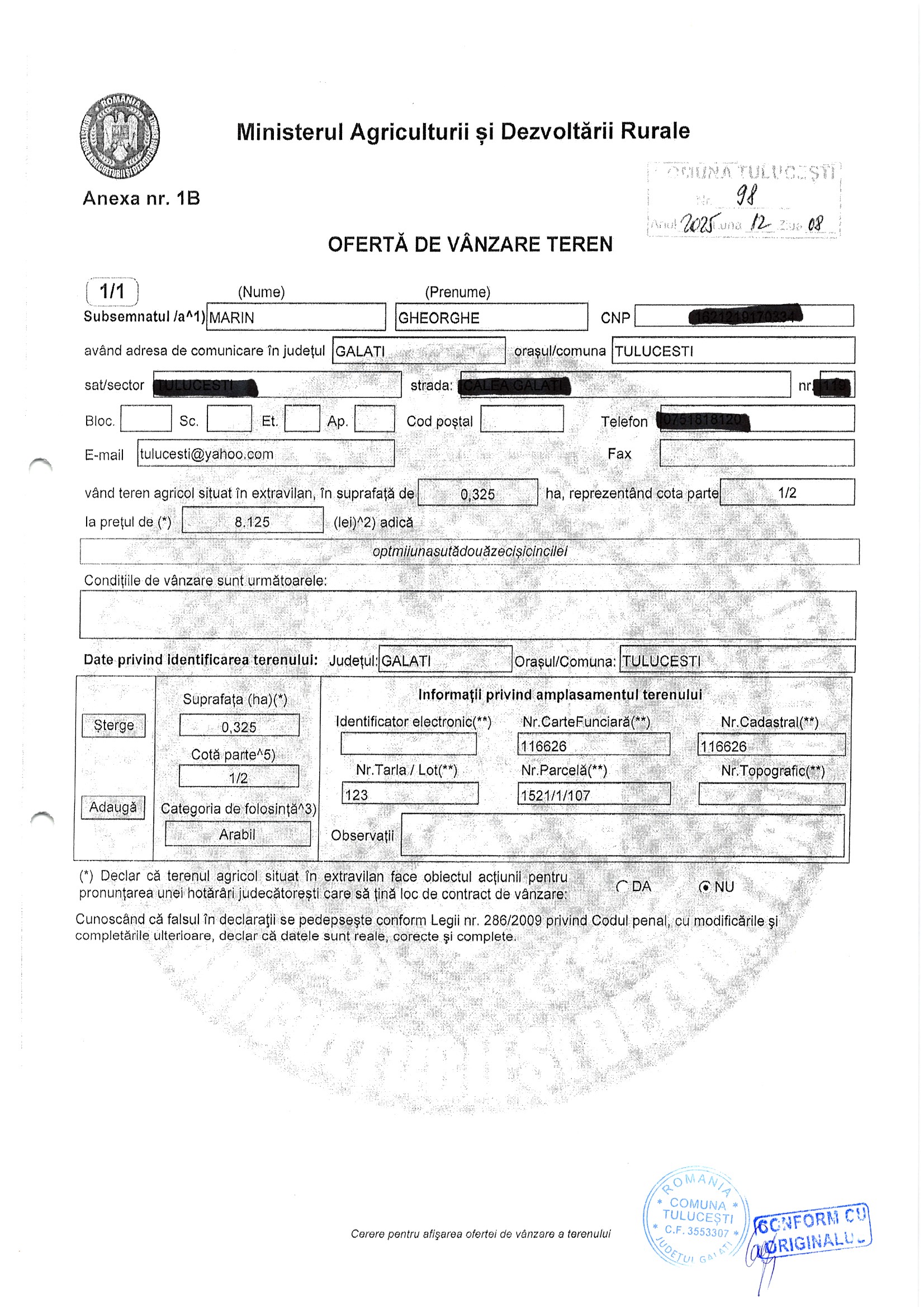 | 06.02.2026 | Marin Gheorghe | 123 | Tulucesti | 0.3250 HA | Dinu Florentina |