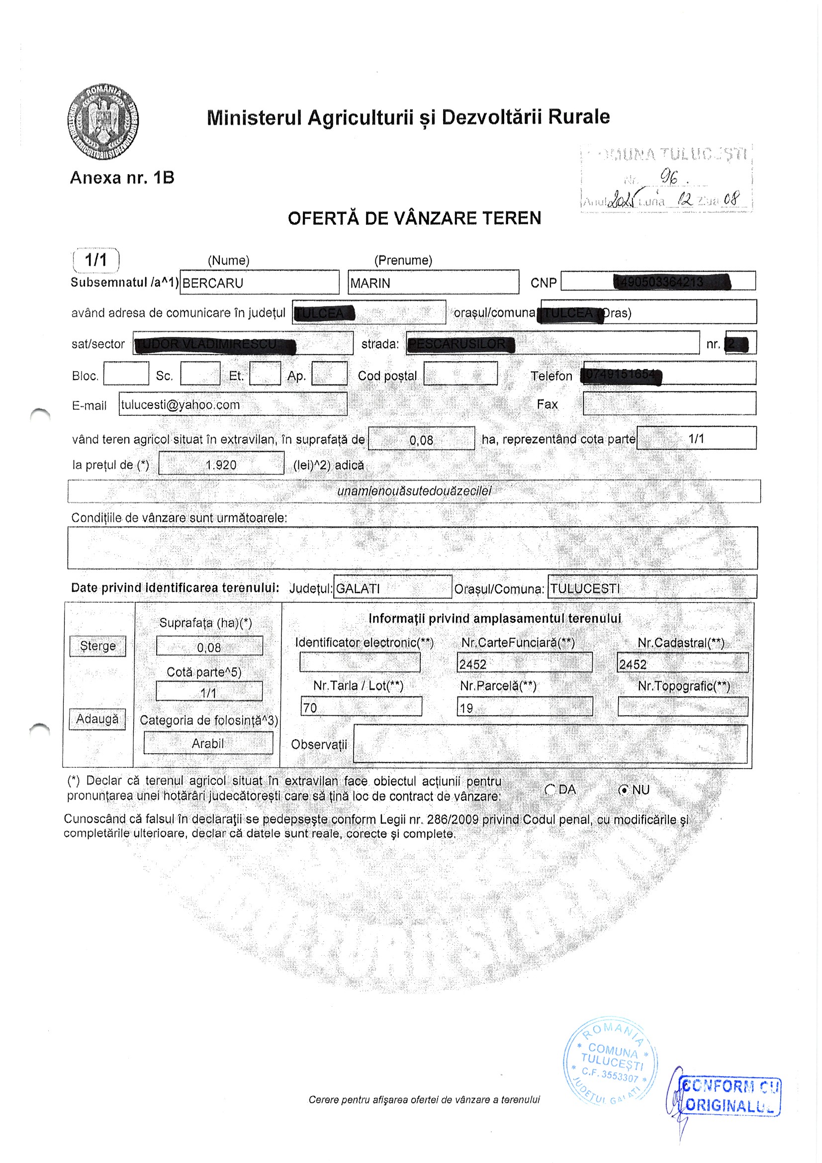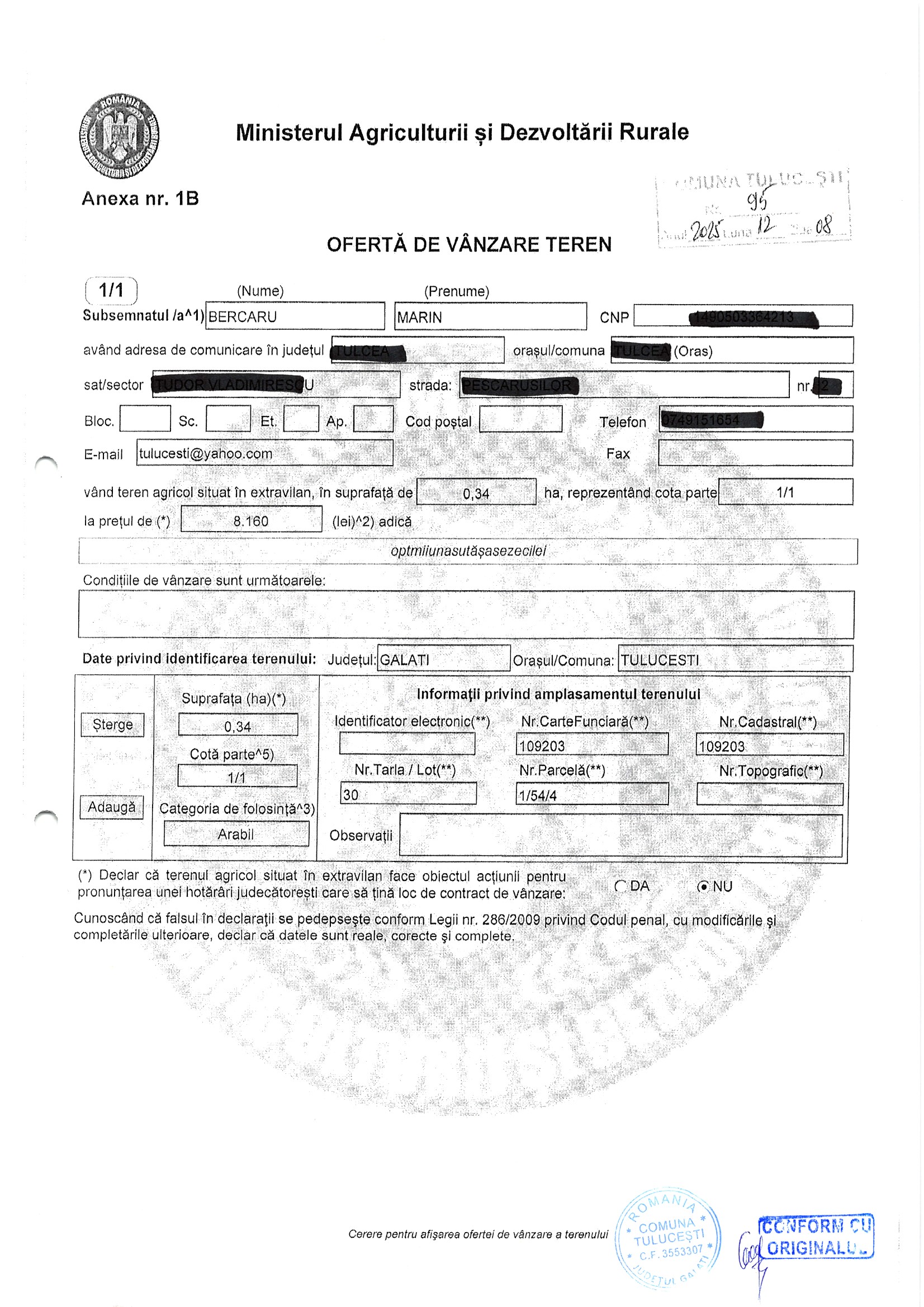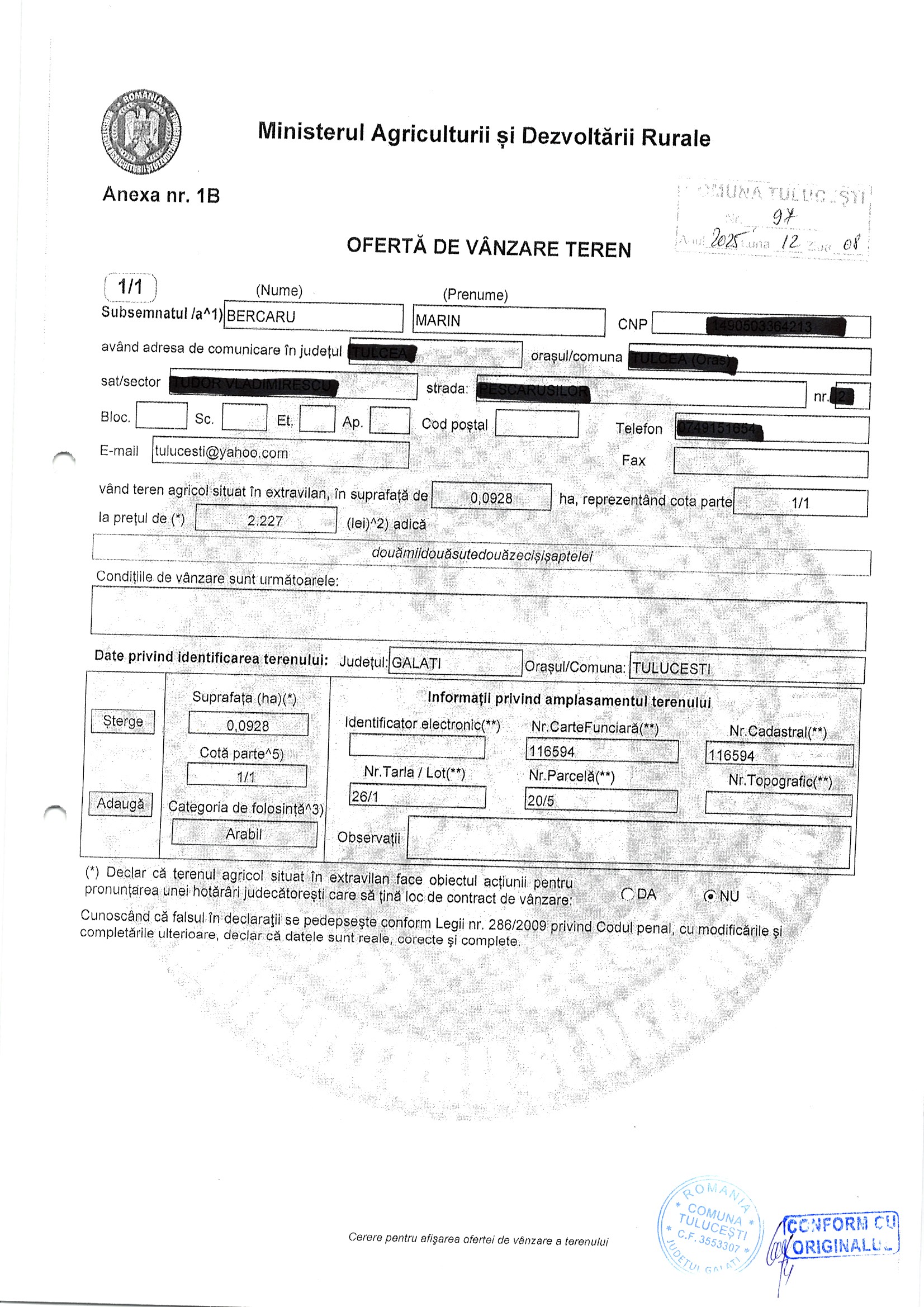 | 06.02.2026 | Bercaru Marin | 123 | Tulucesti | 0.0928 HA | Dinu Florentina |