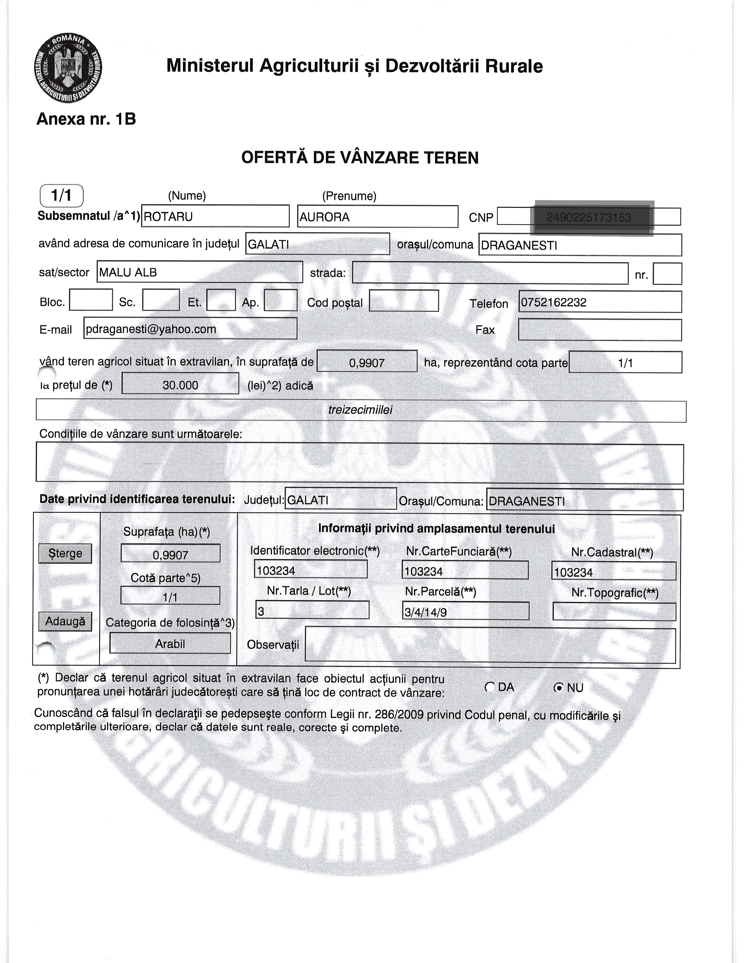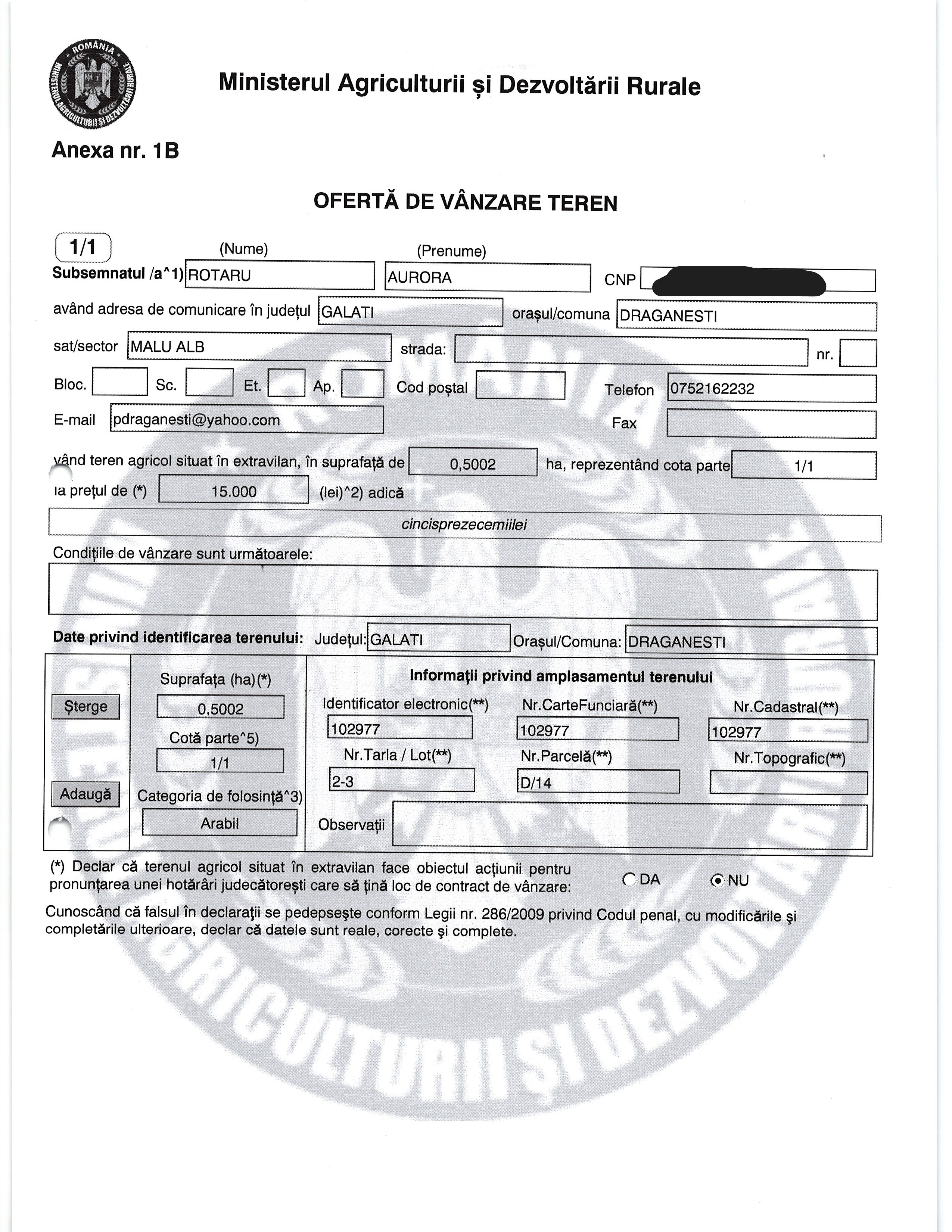 | 05.02.2026 | Oprea Mariuta | 123 | Tulucesti | 0.0762 HA | Dinu Florentina |