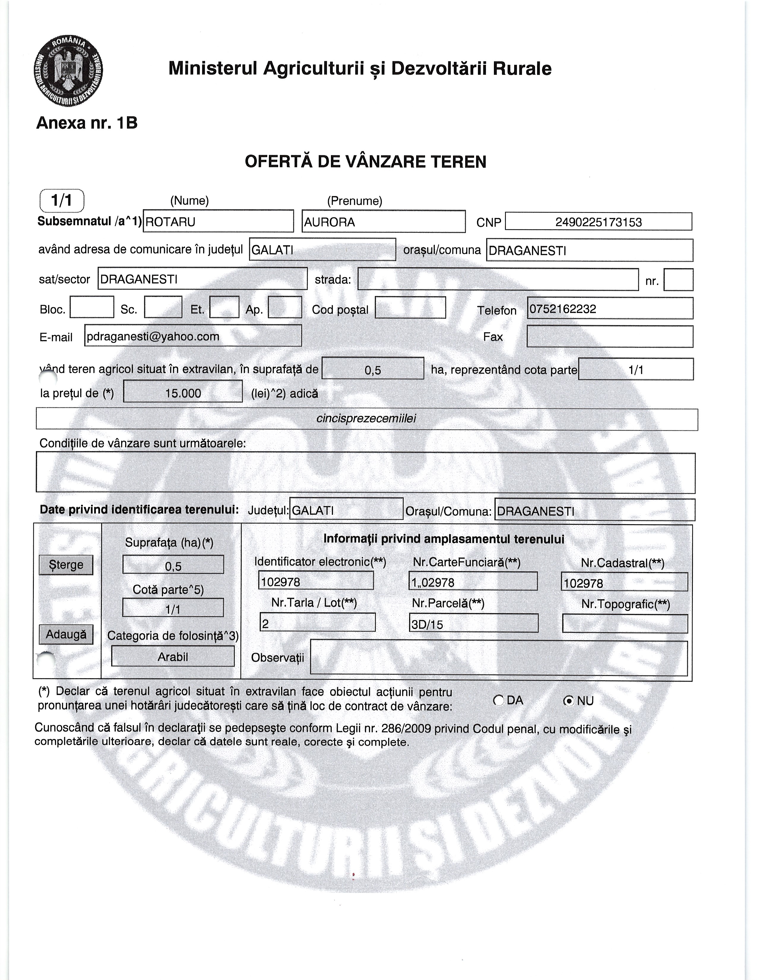 | 02.02.2026 | ROTARU AURORA | 123 | Draganesti | 0.5 HA | Oroviceanu Laura |