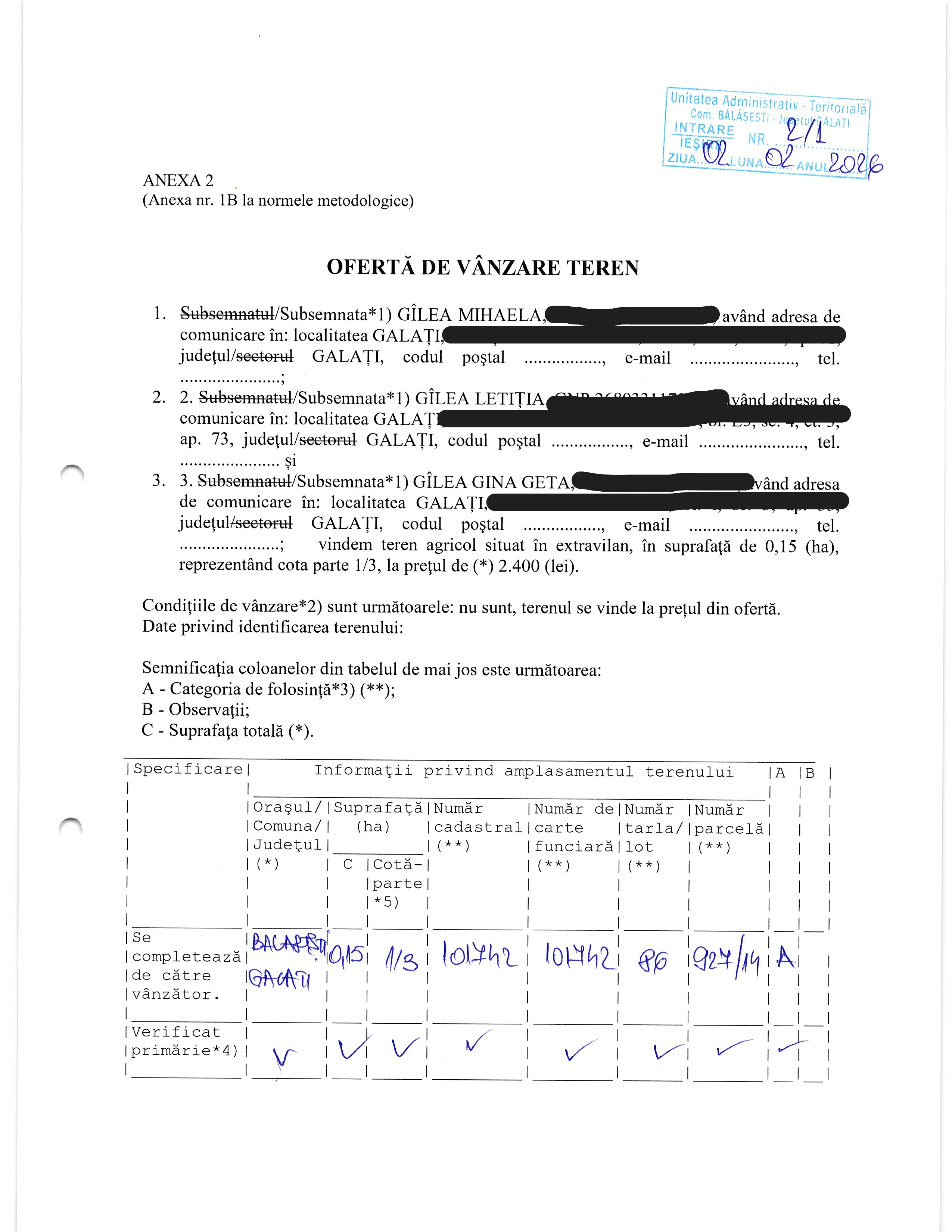 | 02.02.2026 | Gilea Mihaela | 123 | Balasesti | 0.15 HA | Oroviceanu Laura |