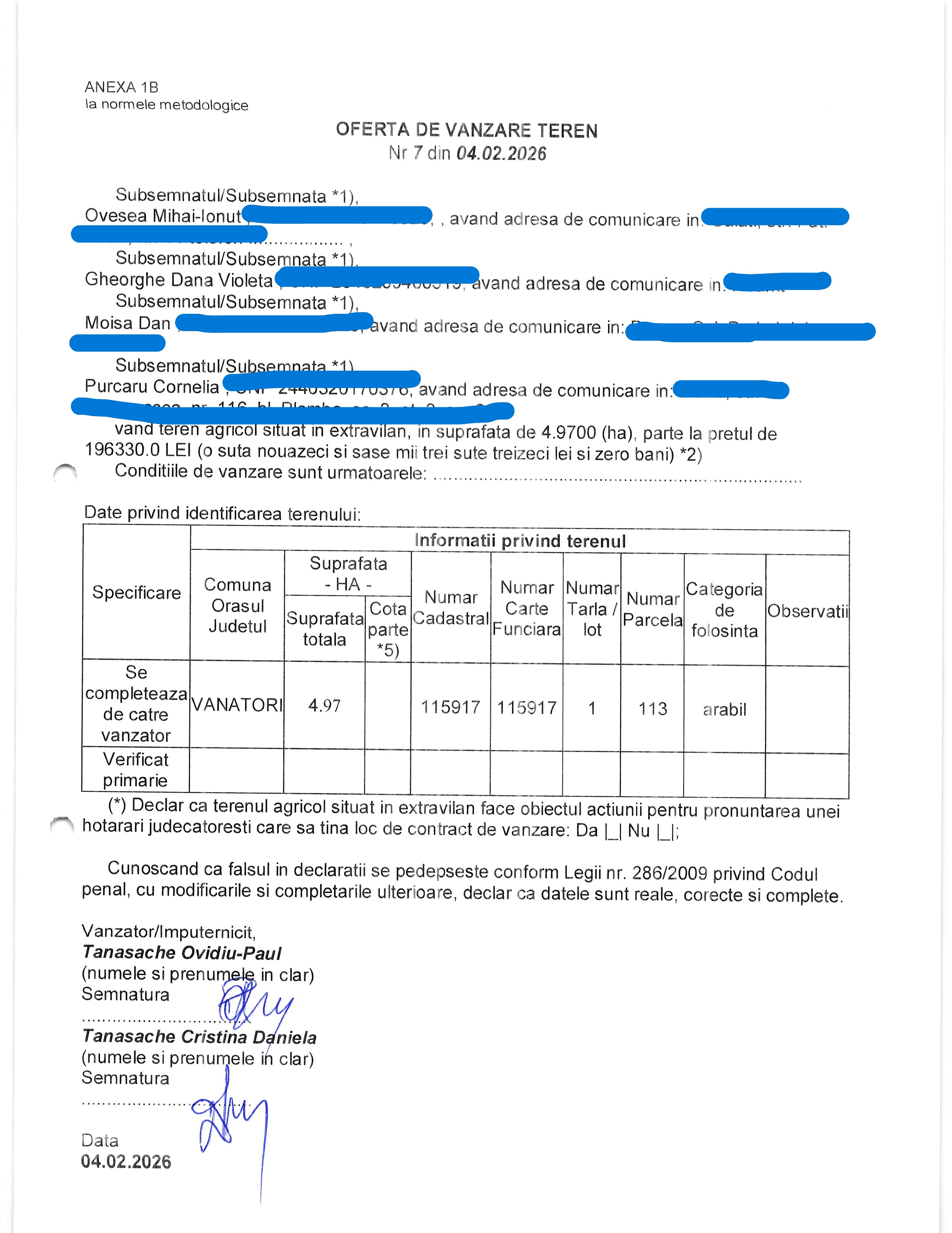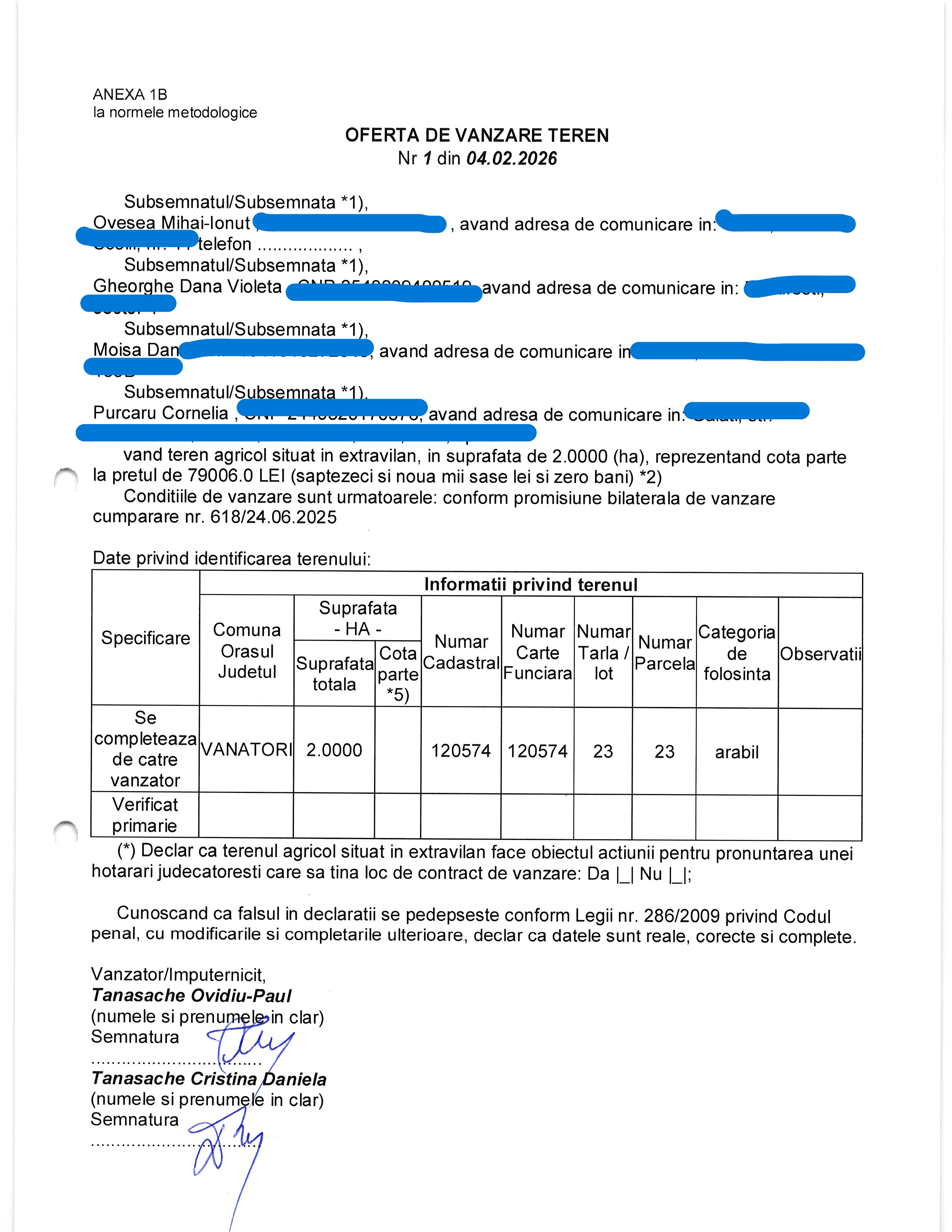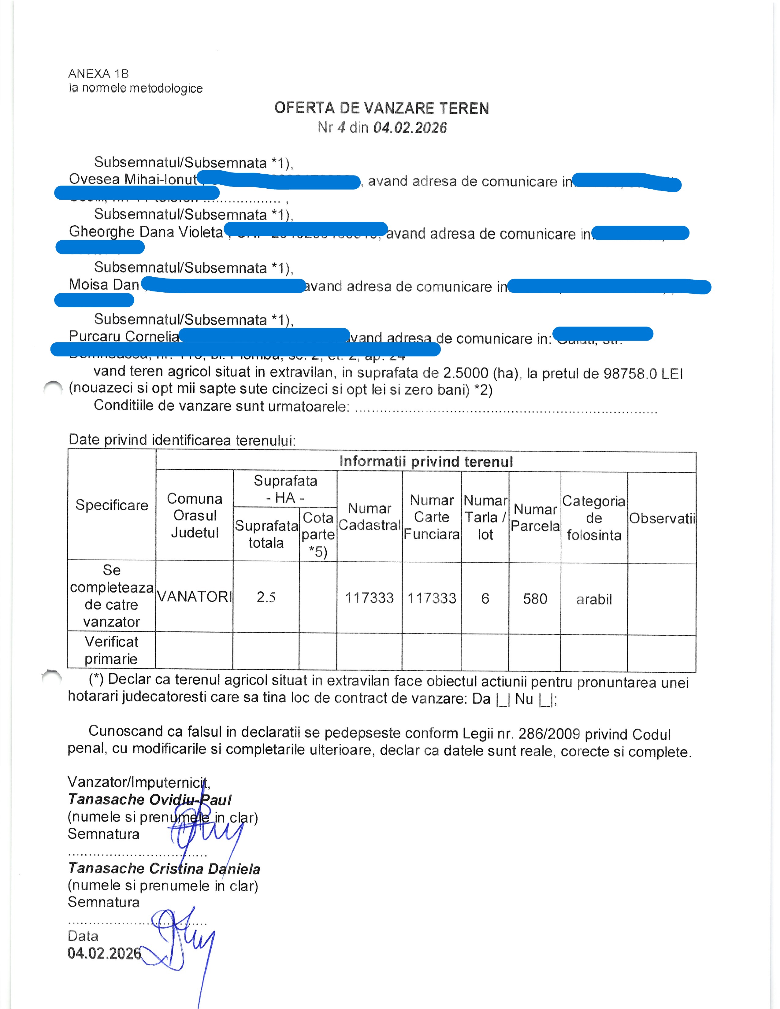 | 05.02.2026 | BARBU IULIUS | 123 | Ghidigeni | 0,9945 HA | Mocanu Monica Elena |