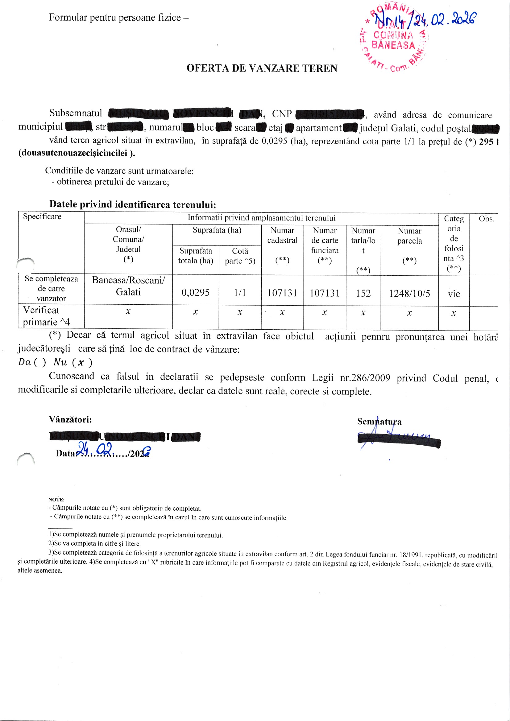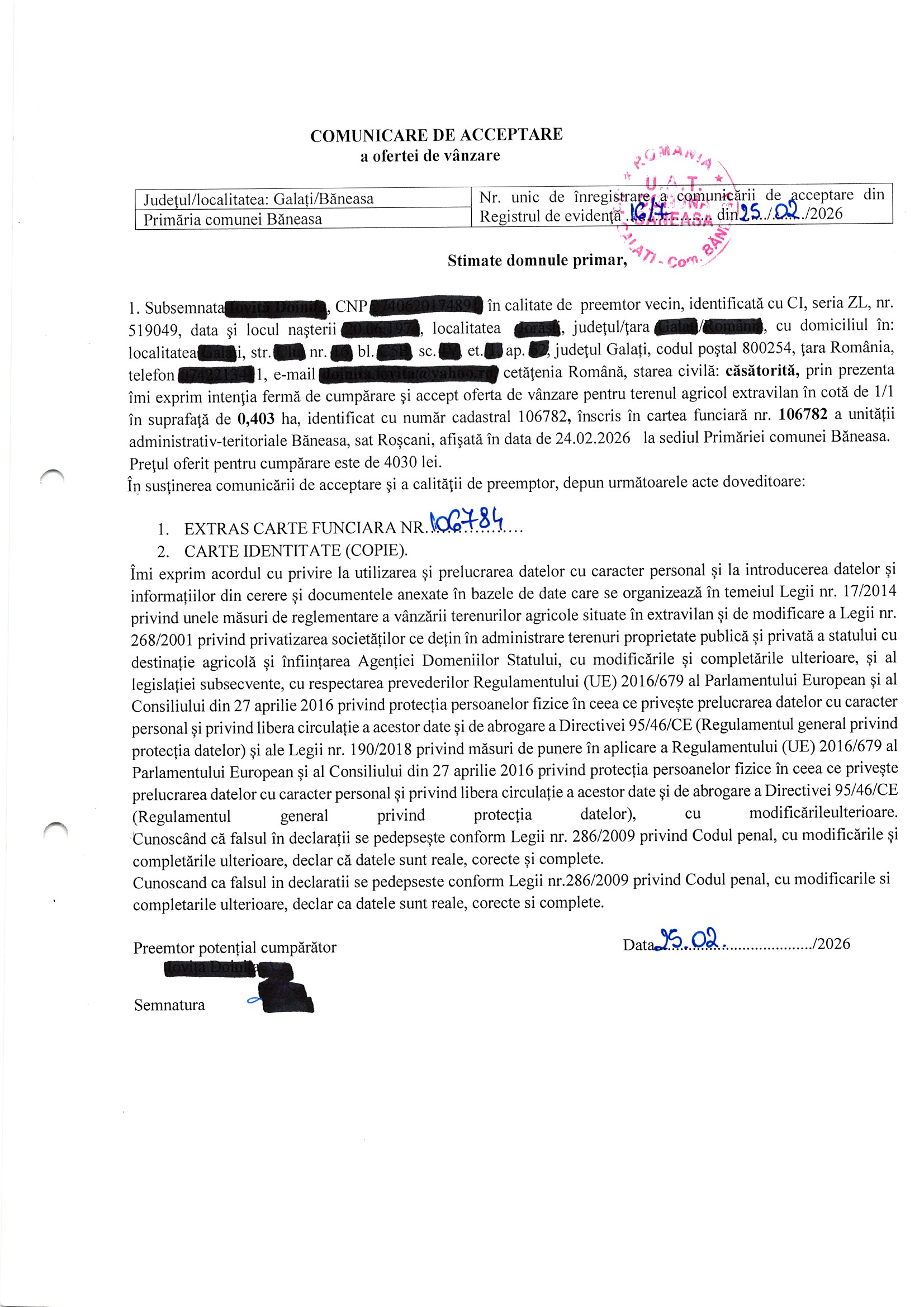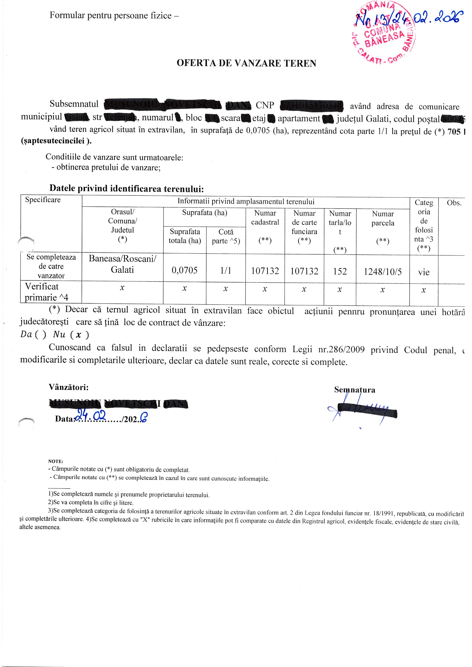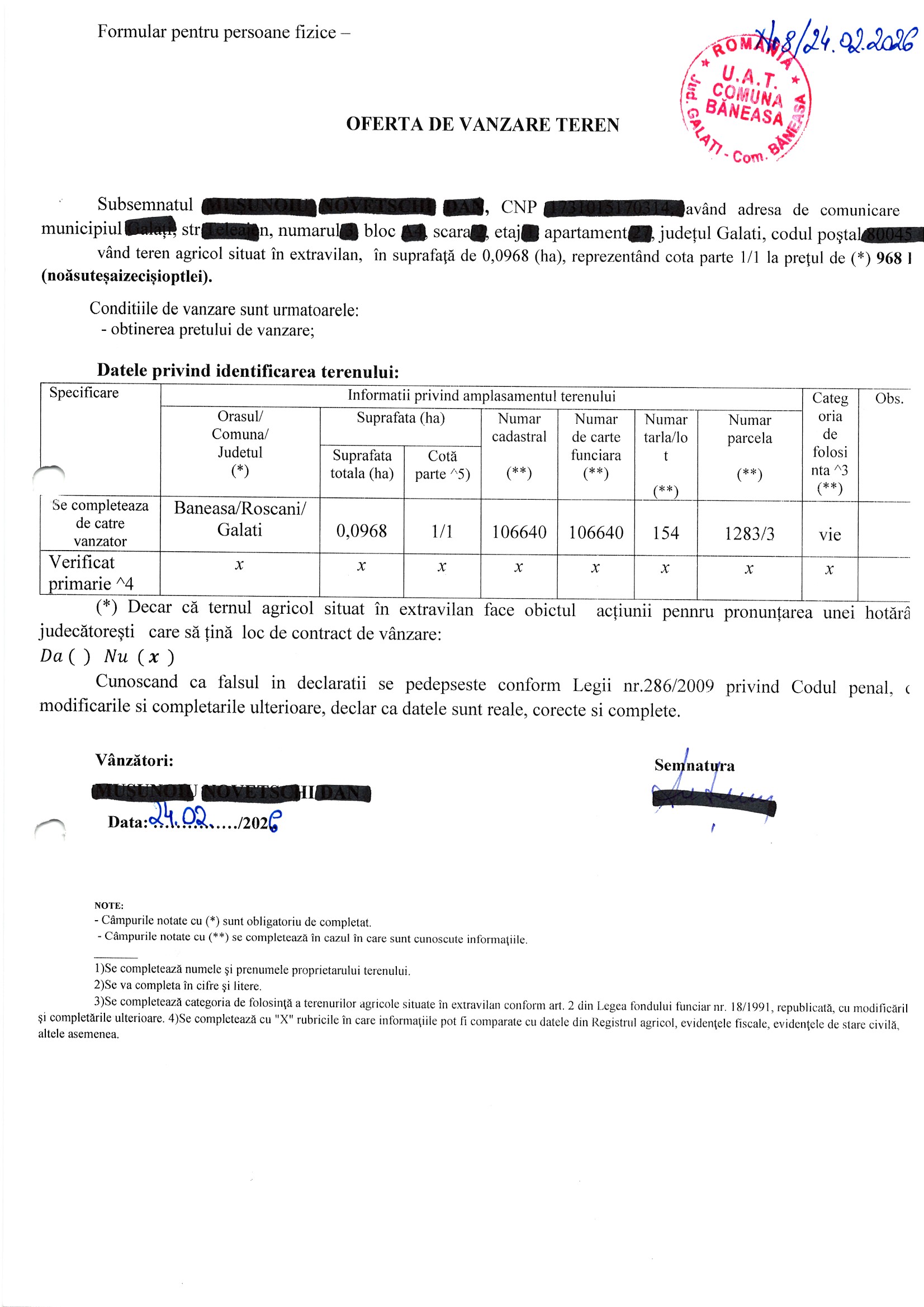 | 03.03.2026 | Musunoi Dan | 123 | Baneasa | 0.40 HA | Dinu Florentina |