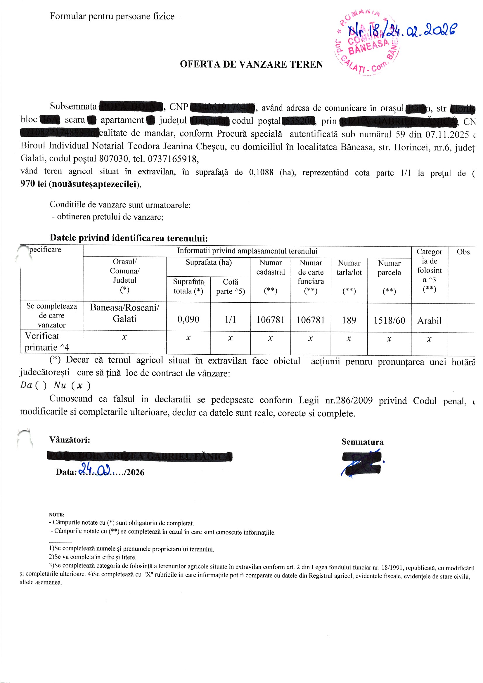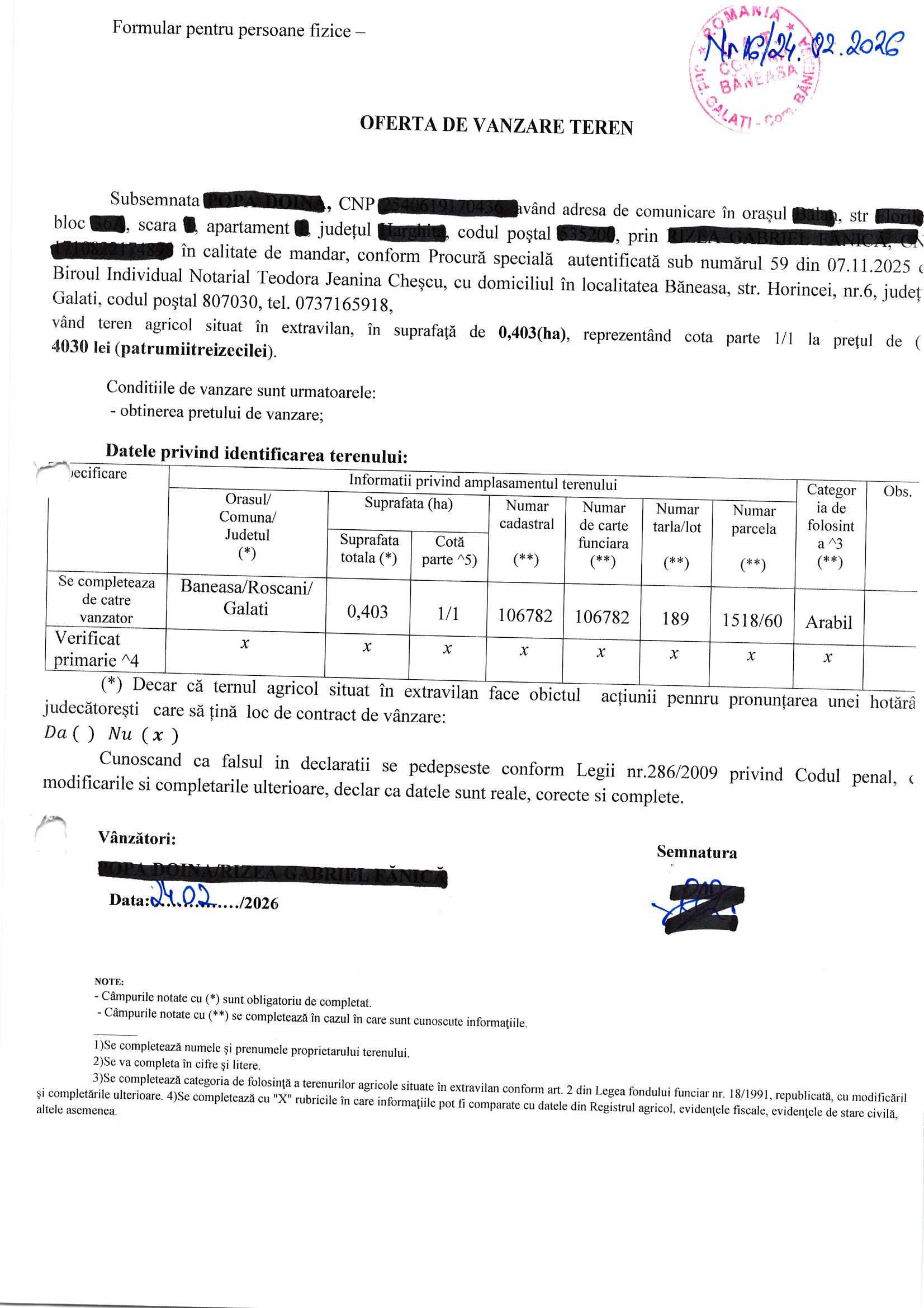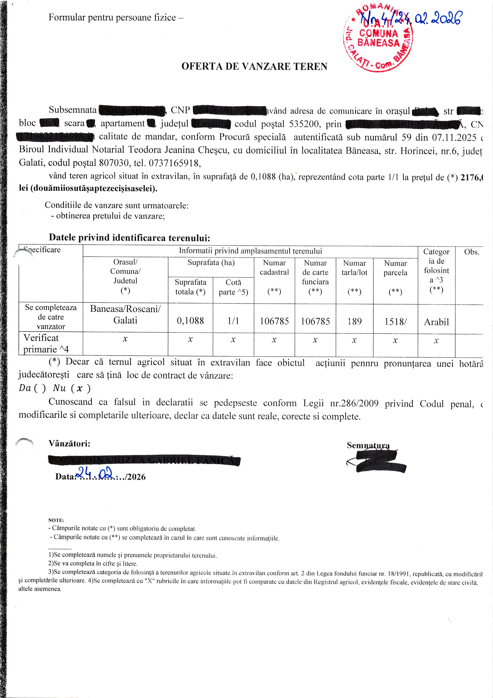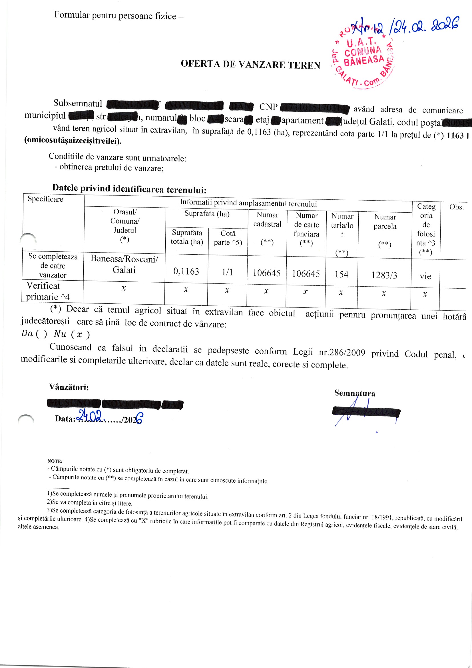 | 03.03.2026 | Popa Doina | 123 | Baneasa | 0.090 HA | Dinu Florentina |